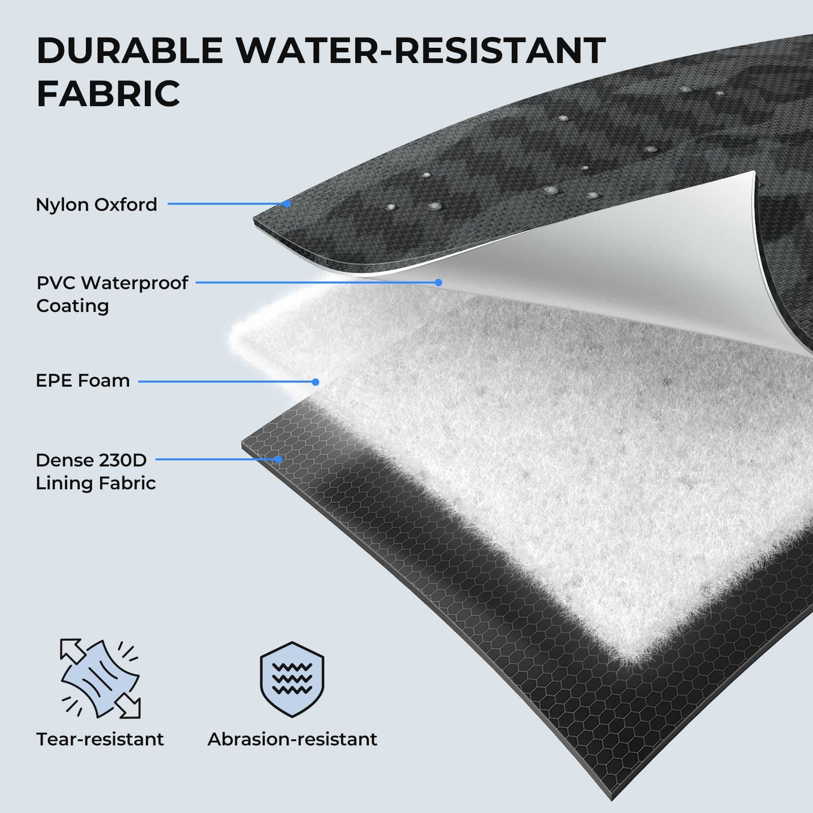 Made with tear-resistant nylon oxford and a 4-layer build, including a PVC water-resistant coating, EPE foam padding, and high-density fabric lining.