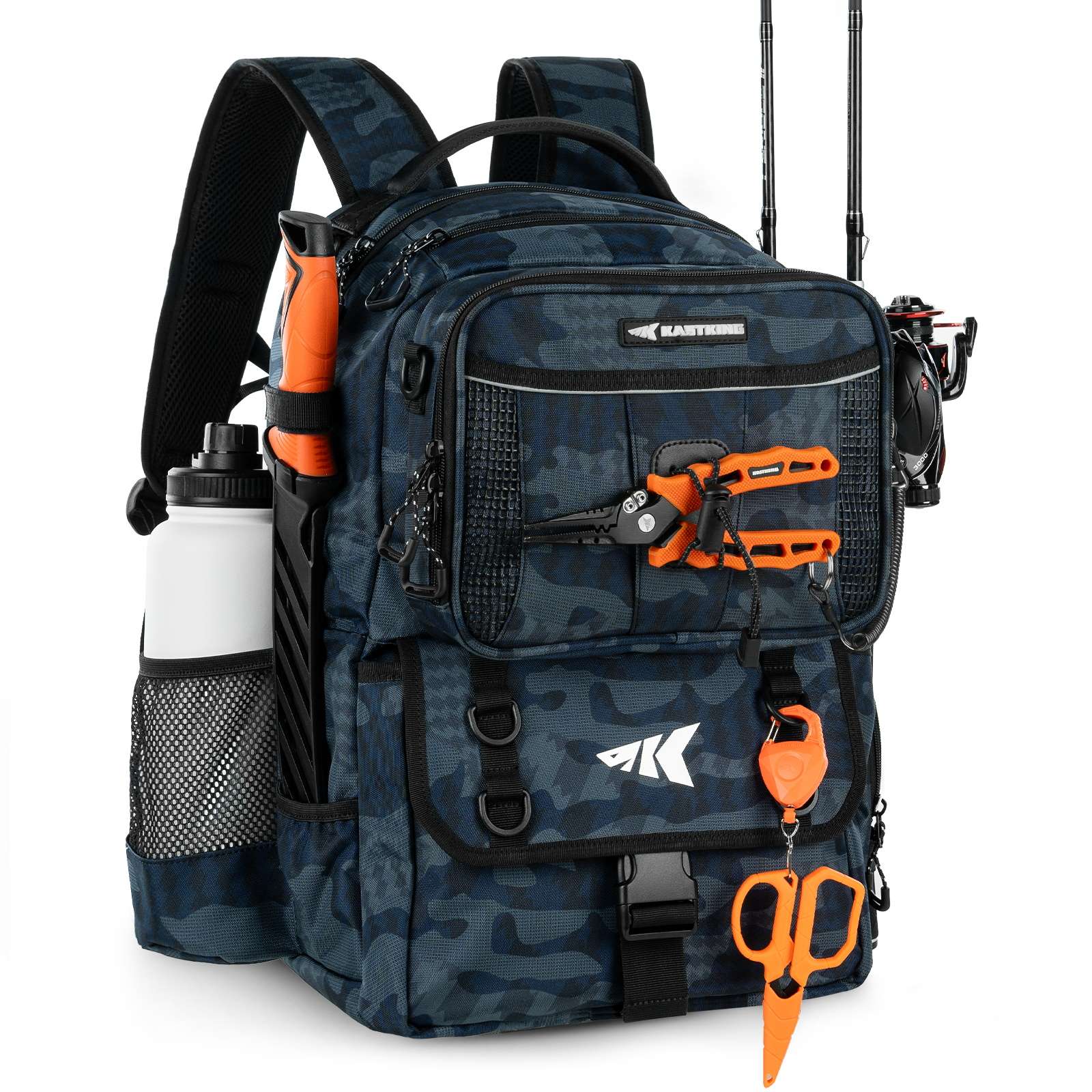Built for rugged fishing conditions, this backpack is made from heavy-duty rip-stop nylon and water-resistant high-density oxford fabric.