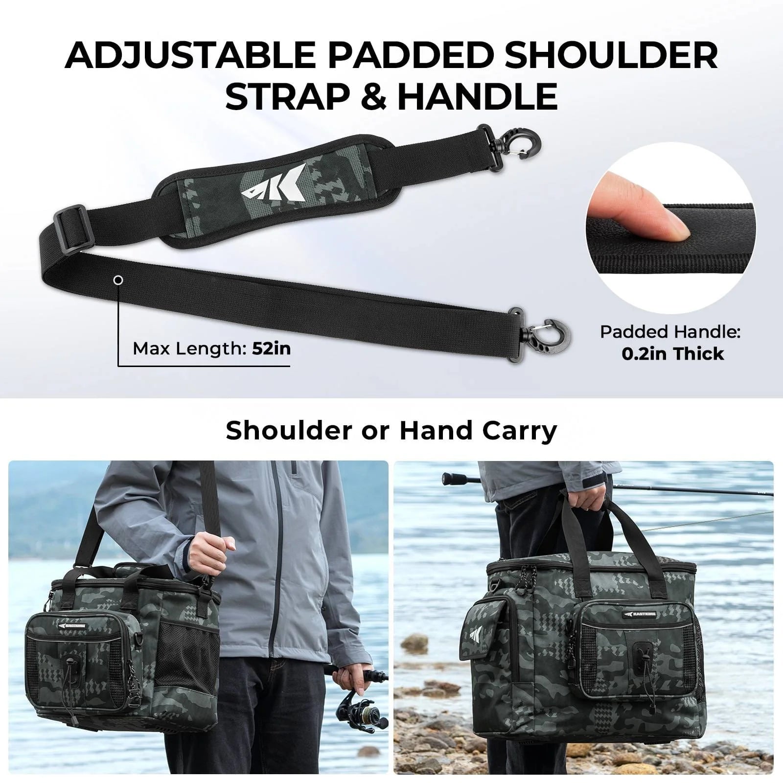 Designed for convenience, these bags have double loop zipper pulls for fast access, a padded handle, and an adjustable, removable padded shoulder strap for comfort. Zippered lid and interior pockets keep valuables secure, while multiple external pockets hold extra utility boxes and baits.