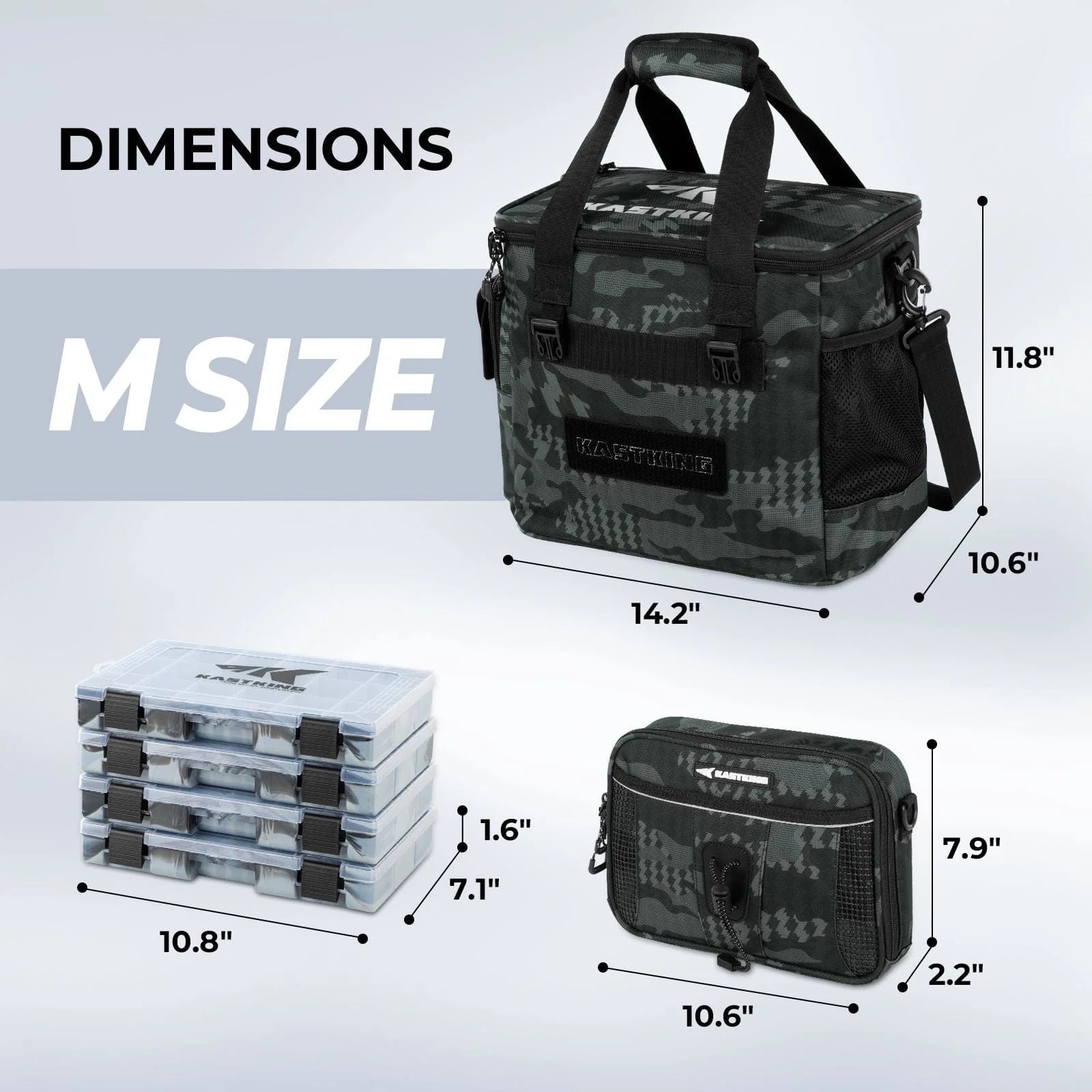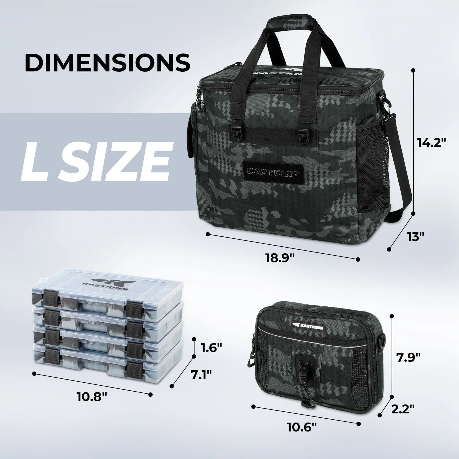 The Large tackle bag holds up to 11 utility boxes (8-3700 size in the main compartment + 1-3700 size in the side pocket + 2-3600 size in the end pockets), while the Medium holds up to 10 utility boxes (7-3600 size in the main compartment + 1-3600 size in the side pocket + 2-3500 size in the end pockets). Each bag includes 4-3600 size black camo utility boxes and multiple storage pockets for baits, lures, and fishing tools.