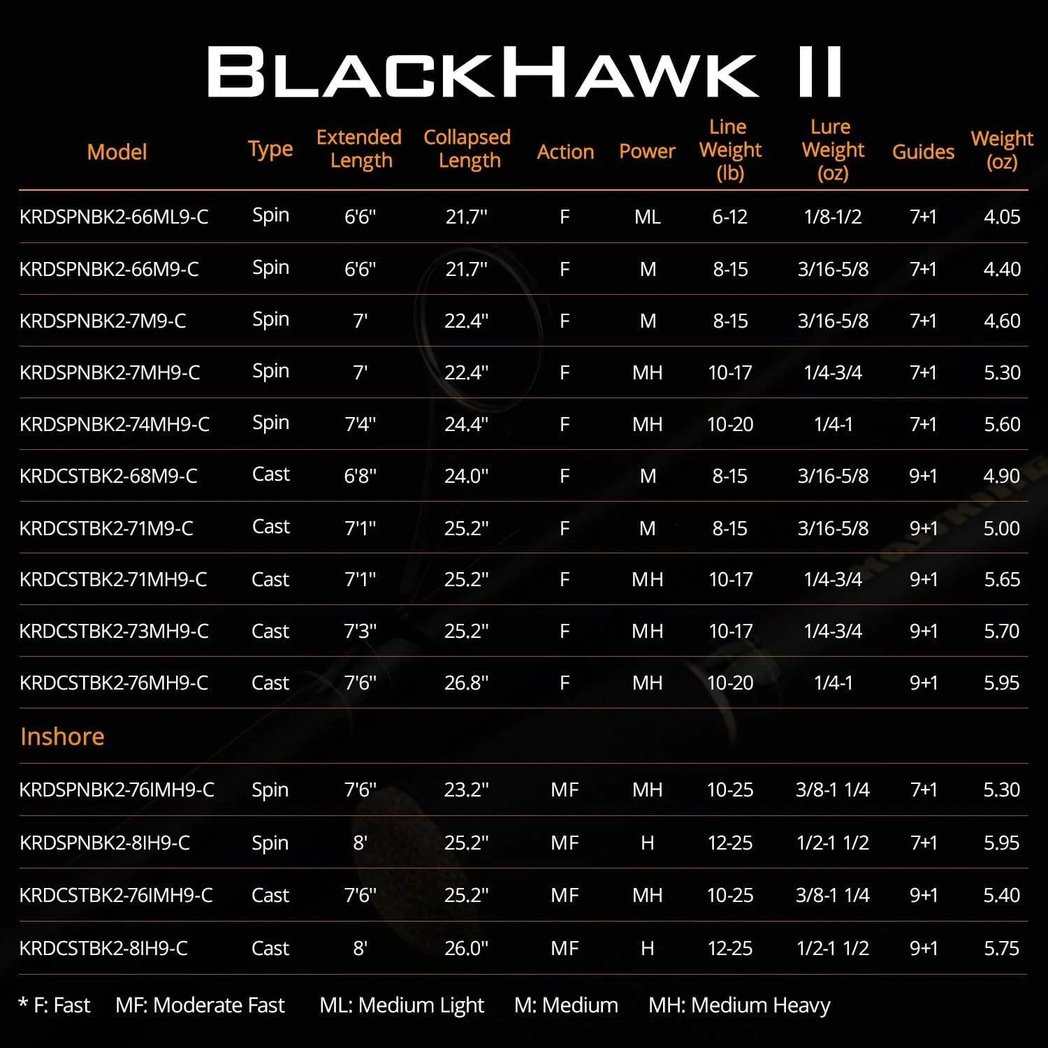 The KastKing BlackHawk II travel fishing rod is available in 14 lengths and actions in travel spinning rod and casting rod models. You'll find the perfect spinning fishing rod or baitcasting rod for almost any fresh or saltwater fishing situation whether your trout fishing, bass fishing, kayak fishing or even as a n inshore fishing rod for saltwater fishing from the bank or boat. KastKing travel rods feature amazing design and perfect balance.