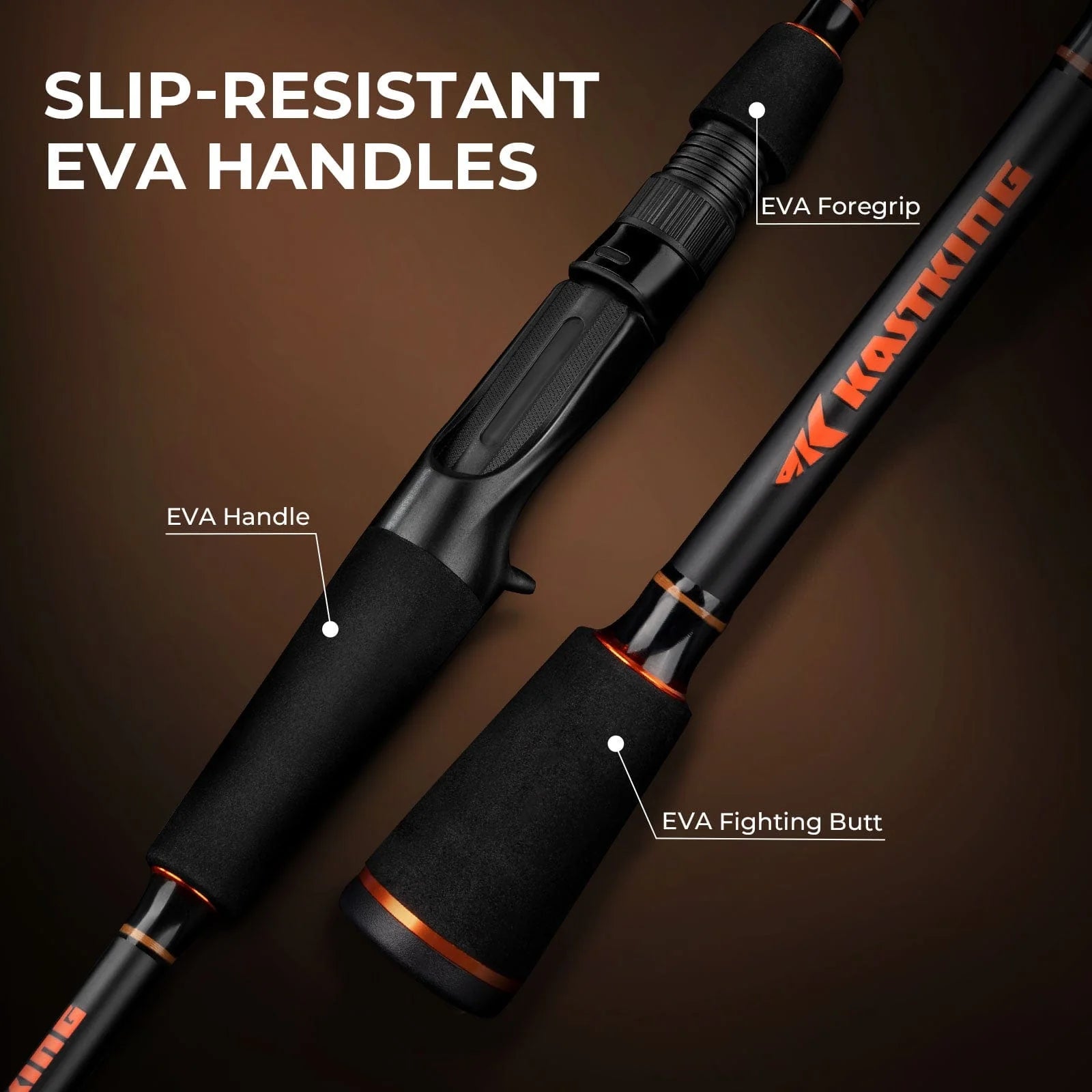 The KastKing Brent Chapman baitcasting rod features a lightweight, sensitive IM6 carbon fiber composite blank (7'0") with medium-heavy power, offering precise casts and enhanced bite detection. Its two-piece design enhances portability without sacrificing strength.