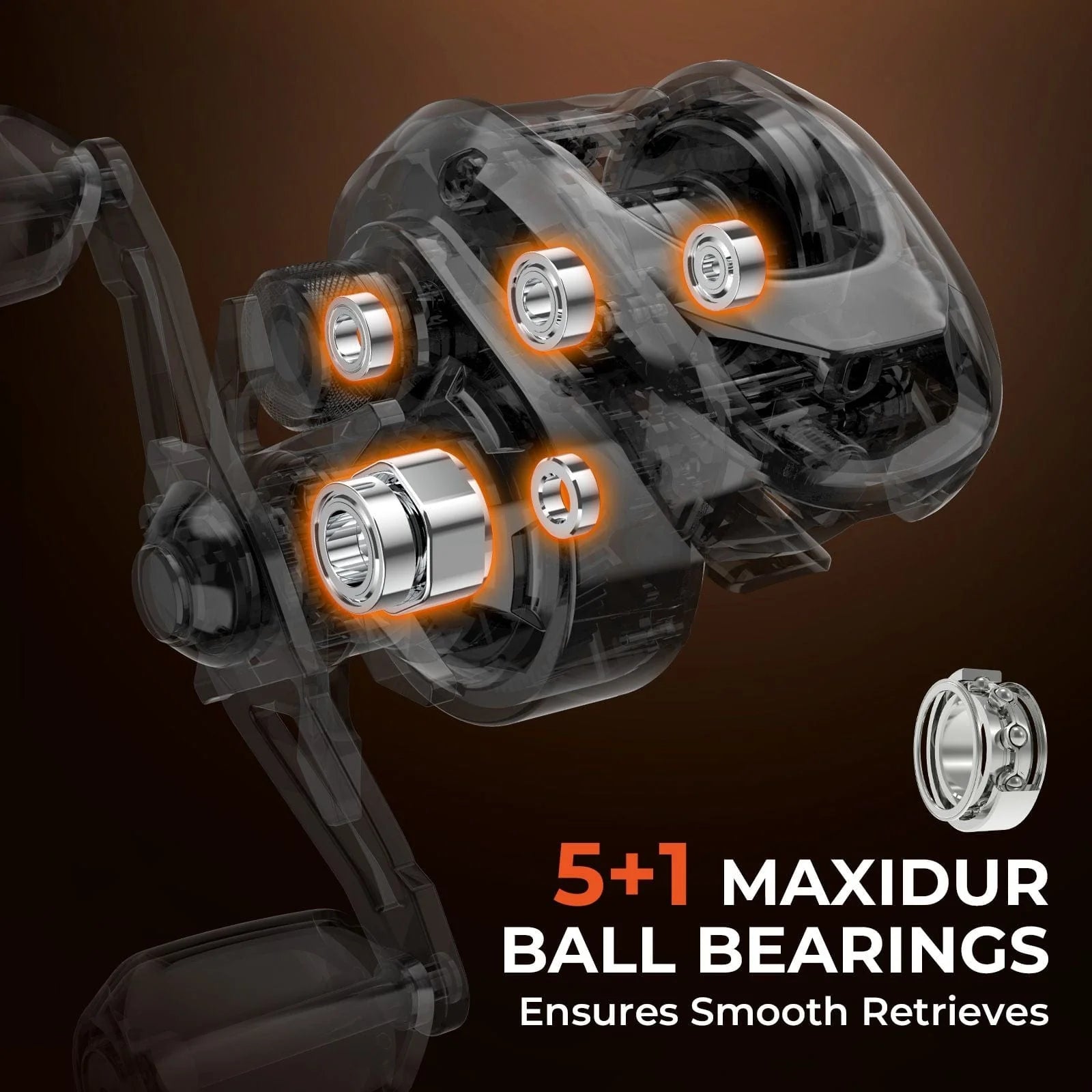 This 5+1 bearing graphite baitcasting reel combines smooth performance with advanced functionality. The lightweight aluminum spool and handle reduce weight without sacrificing durability. With a 7.1:1 gear ratio, this reel provides smooth retrieval, making it perfect for various fishing techniques. The magnetic brake system offers easy, intuitive adjustments for optimal casting control, minimizing backlash for a seamless and consistent casting experience.