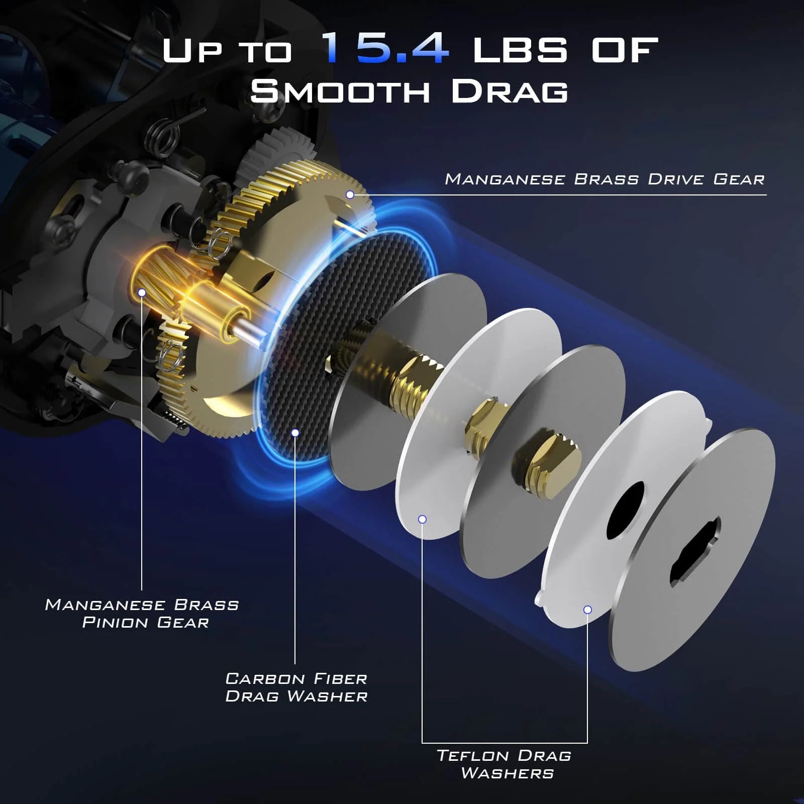 5 double-shielded stainless steel ball bearings + 1 anti-reverse bearing for smooth, reliable performance. Manganese Brass main & pinion gears & 10-magnet braking system with outside adjustment get the work done with minimal effort.