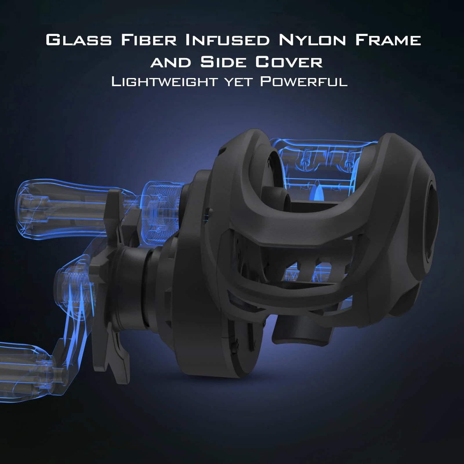 Weighing in at only 7.6 ounces, the Centron Lite Baitcasting Reel has a narrow, Glass Fiber infused Nylon frame that is ultra-light and ultra-powerful. The compact size low profile baitcaster fishing reel is ergonomically designed for comfort.