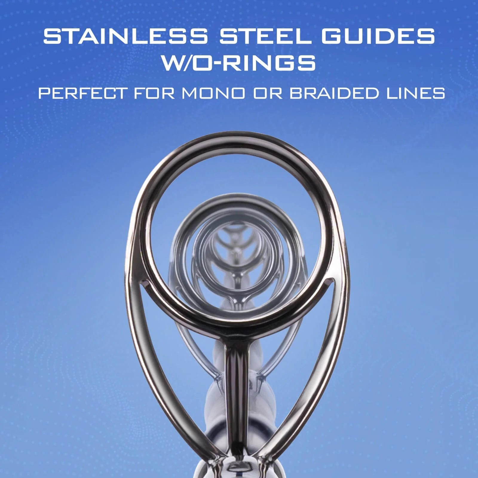 Strong and durable stainless-steel guides are used on all models with premium ceramic ring inserts that perform perfectly with both mono or braided lines. The lightweight stainless frames look great and keep the weight down for a perfectly balanced rod blank.