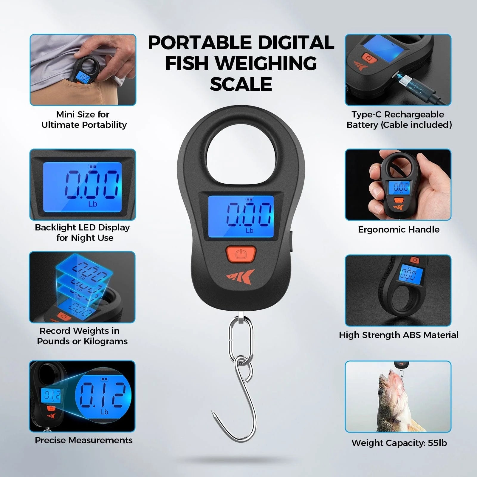 Designed with an ergonomic handle and high strength ABS material, the fishing scale offers precise measurements. Its rechargeable battery and USB-C cable make it convenient. With 55lb of weight capacity and features an easy-to-read backlight LED display, it switches between pounds and kilograms easily. Includes a 49"/1.2m tape measure for accurate measurements. The lip grip features one-handed operation and no-puncture design.