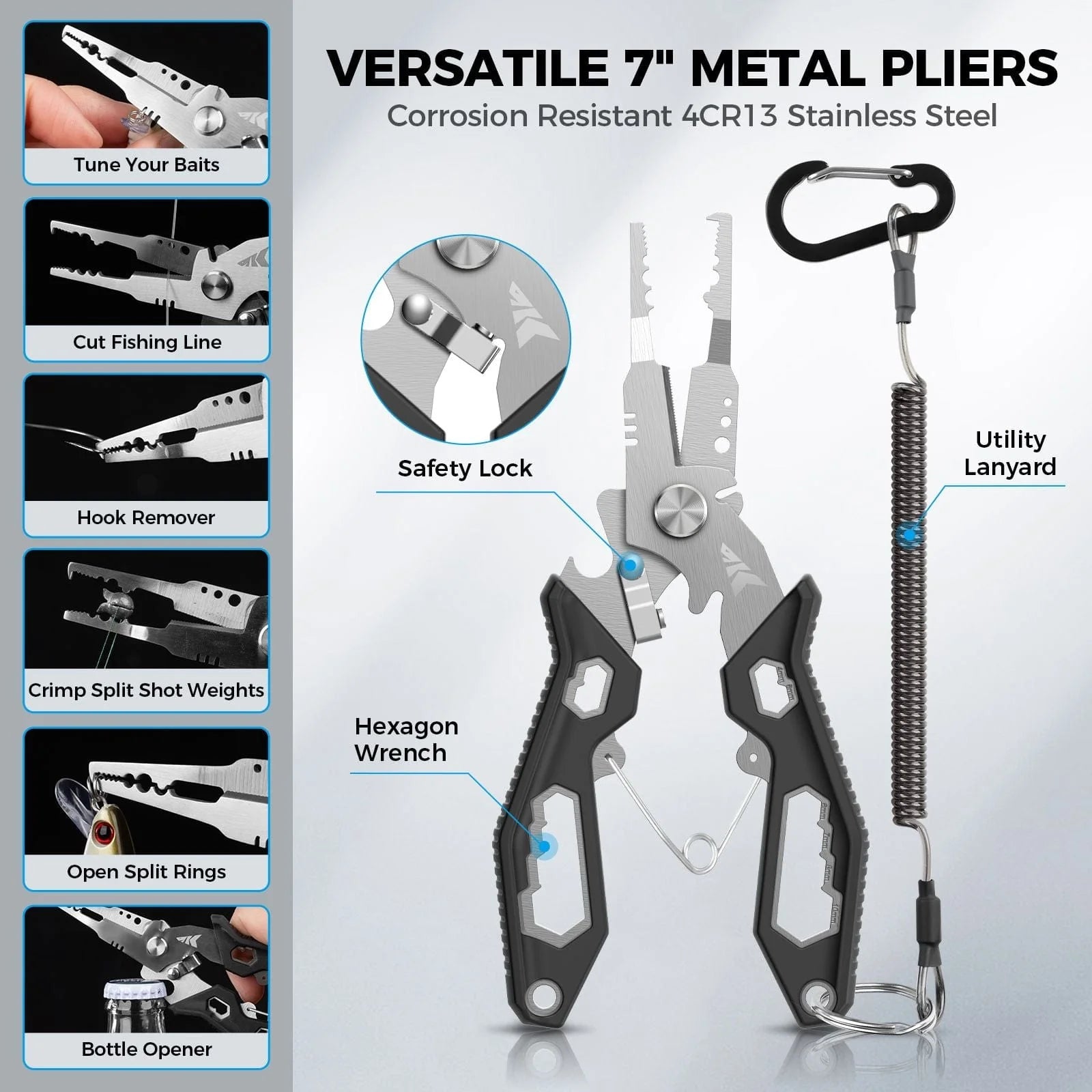Crafted from corrosion-resistant 4CR13 stainless steel, this fishing pliers is built to last in tough environments. The non-slip elastomer ergonomic curved handle ensures a secure and comfortable grip, even with wet hands. Designed for versatility, it comes with a lanyard and a safety lock. The fishing pliers handles multiple tasks with ease, including bait tuning, line cutting, hook removal, crimping split shot weights, and opening split rings.