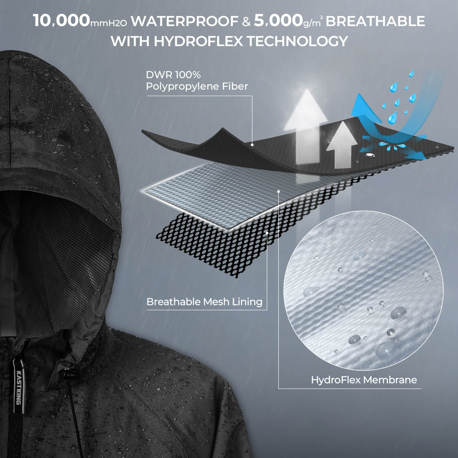 Crafted with innovative 3-layer construction, our HydroSense Rainsuits feature a DWR 100% polypropylene fiber outer layer, a middle HydroFlex membrane that’s waterproof and breathable (10,000mmH2O, 5,000g/m²), and a breathable mesh lining. This advanced design effectively blocks out the elements while allowing excess heat and moisture to escape, ensuring you stay dry and comfortable in any conditions.
