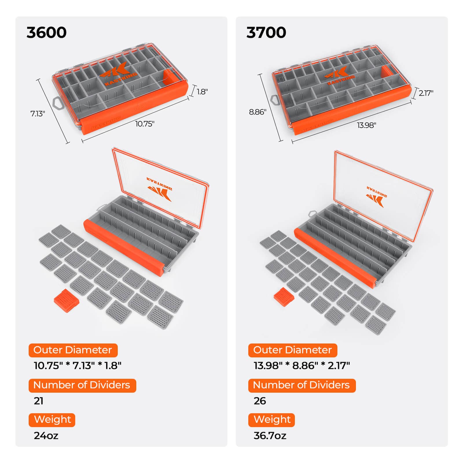 The KastKing HyperSeal Waterproof Tackle Box comes in two different sizes, 3600 and 3700 boxes that fit in popular tackle bags or boat storage systems.