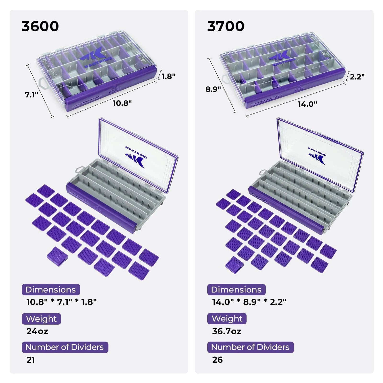 The tackle organizer has adjustable dividers that allow the angler to create a custom fit for all sizes of lures (the 3700 deep tackle box features 33 adjustable dividers ). Removable dividers lock into place and do not allow hooks and terminal tackle to move between spaces during travel or in a boat. Each divider has small holes to allow for additional ventilation during storage. Each box comes with a desiccant to keep your lures rust free. The transparent lid makes it easy to identify which lures are in the box before opening.