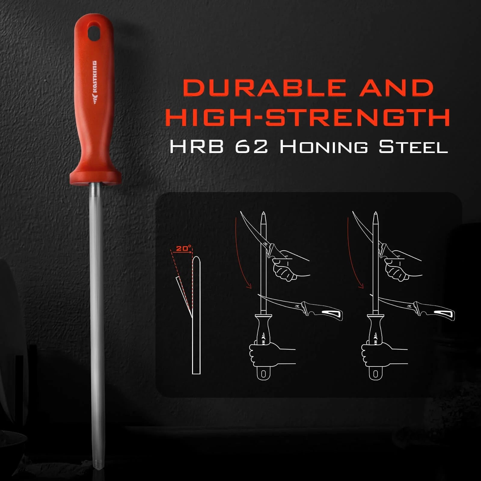 All KastKing Intimidator knives come with a professional honing rod so you can maintain a precise razor-sharp edge on your knives. The super hard HRB 62 rod allows you to hone the edge of your knife quickly and easily, and the ergonomic non-slip handle will help keep you safe.