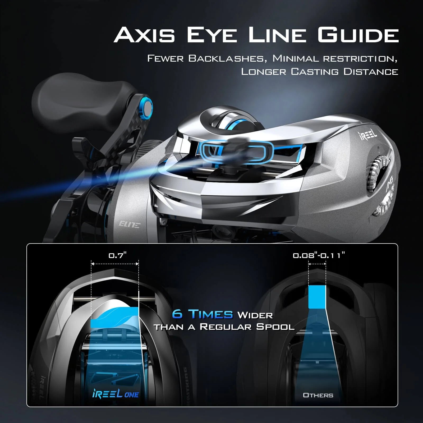 - Proprietary Axis Eye line guide is yet another innovative mechanism designed, uniquely shaped and rotating Axis Eye presents a very wide line-out aperture and a straight shot off the reel and through the line guides for longer and more accurate casts.