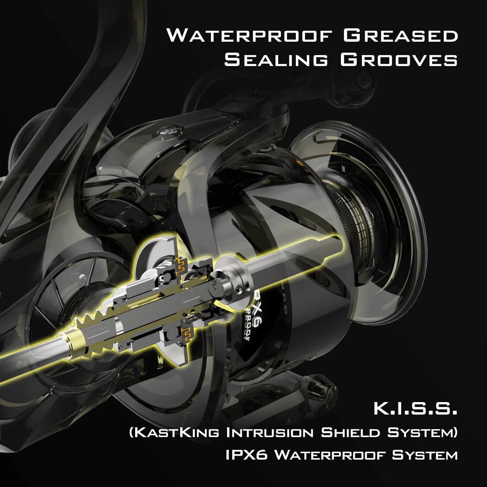 Specially engineered for offshore saltwater fishing. Kapstan Elite Spinning Reel is KastKing’s highest level 100% Waterproof fishing reel at level of IPX6, with up to 15 EverSeal rubber rings to keep water out of the main gear. The KastKing Intrusion Shield System includes labyrinth-style greased sealing grooves that reduce rotational resistance and provide an innovative water-tight seal.