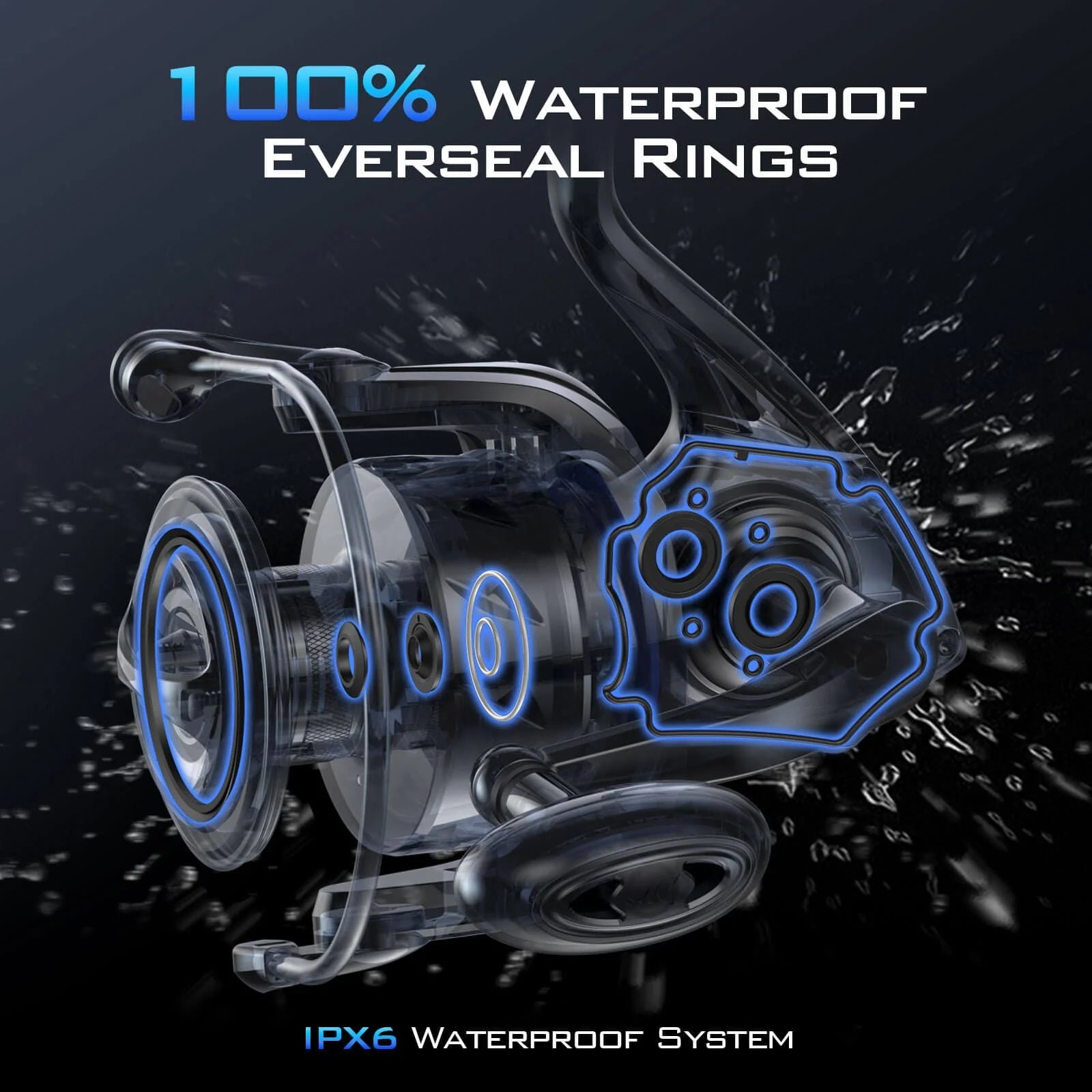 Dive into the world of saltwater angling with confidence. The Kapstan SE Saltwater Spinning Reel boasts IPX6 waterproof protection, enhanced by up to 15 EverSeal rubber rings positioned to thwart water intrusion and the labyrinth-style greased sealing grooves ensure a water-tight seal against the elements. The seamless one-piece bail, crafted with utmost precision, eliminates the risk of rusting or tangling with your fishing line, maximizing every cast and retrieve.