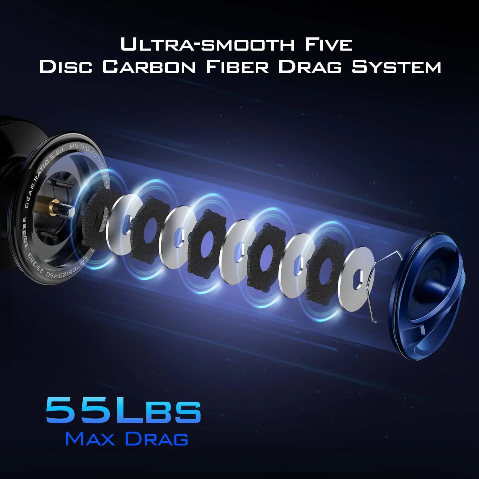 This reel offers versatile drag capabilities. Sizes 2500/3000/4000 feature an ultra-smooth triple-disc carbon fiber drag system, yielding a remarkable 30lbs of max drag. Sizes 5000/6000 incorporate four-disc carbon fiber drag system, delivering 40lbs of max drag. Size 8000 offers five carbon fiber discs, offering an impressive 55lbs of max drag.