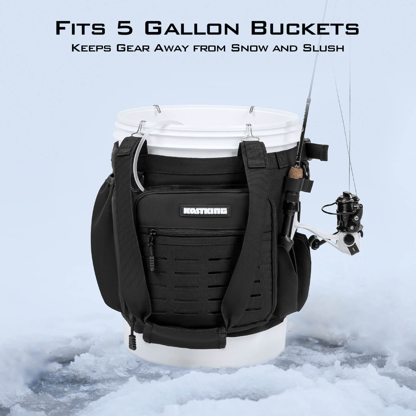 Karryall Ice Fishing Bucket Organizer offers a well-structured and protected storage solution. It includes a zippered pocket with air tube slots for aerator pumps and spare batteries, a zipper pocket for small tackle boxes, gloves, and more. There is even a holster for electric drills to run your auger. Mesh pocket for tackle boxes, two rod holders and a fishing plier holder make the Karryall Ice Bucket organizer perfect for your next trip. Additionally, it features a MOLLE system for securing scissors, tools and various fishing accessories.