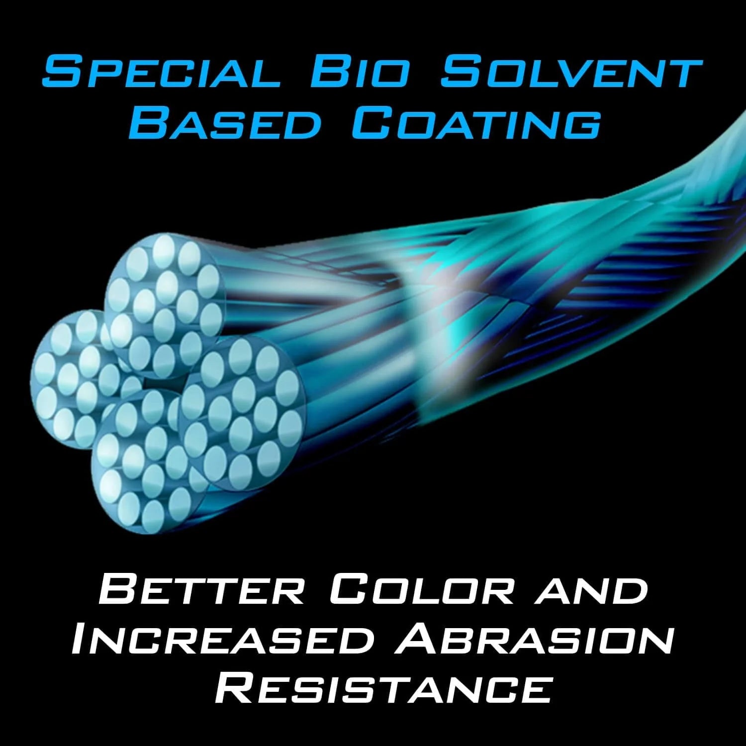 KastPro is coated to be color fast and has better abrasion resistance. Other brands use a water based coating which tends to merely rest on the surface of braid line and is naturally repelled by the braid material. This results in color fading and reduced abrasion resistance over time. The KastPro process uses a bio solvent based coating that penetrates and wicks into the braid for a more uniform coating with better color, coating life, and increased abrasion resistance.