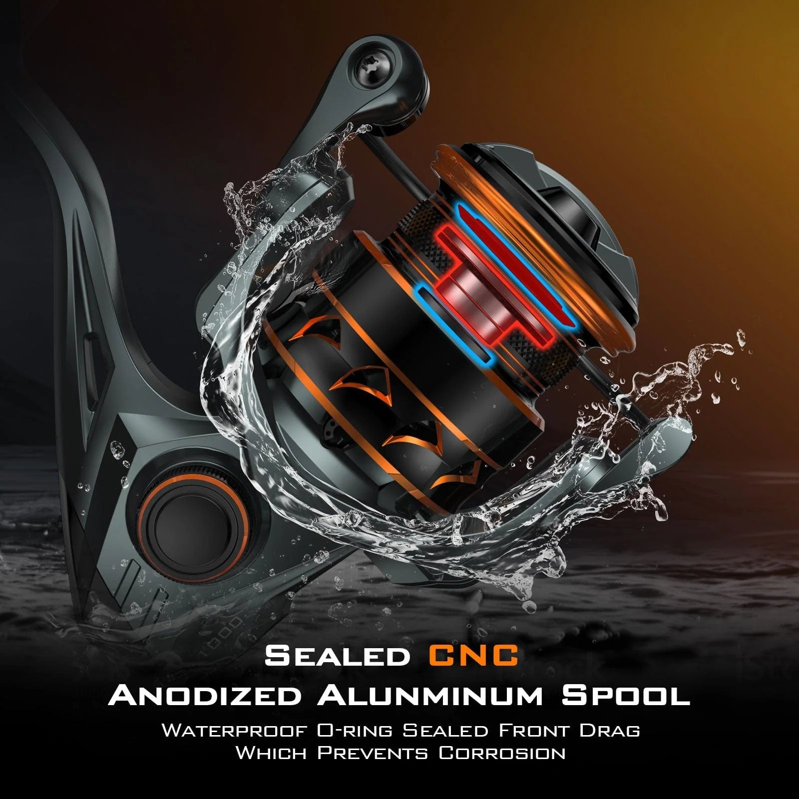The carbon fiber drag washers deliver 10 lbs of smooth stopping power and the reel is built with a 7075 aluminum main shaft & 2014 aluminum drive gear, solid brass pinion gear, and a shallow cut CNC 6061 aluminum braid-ready spool.