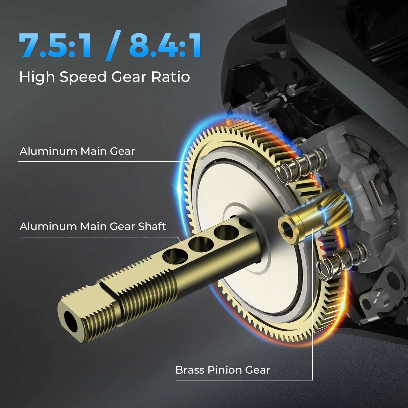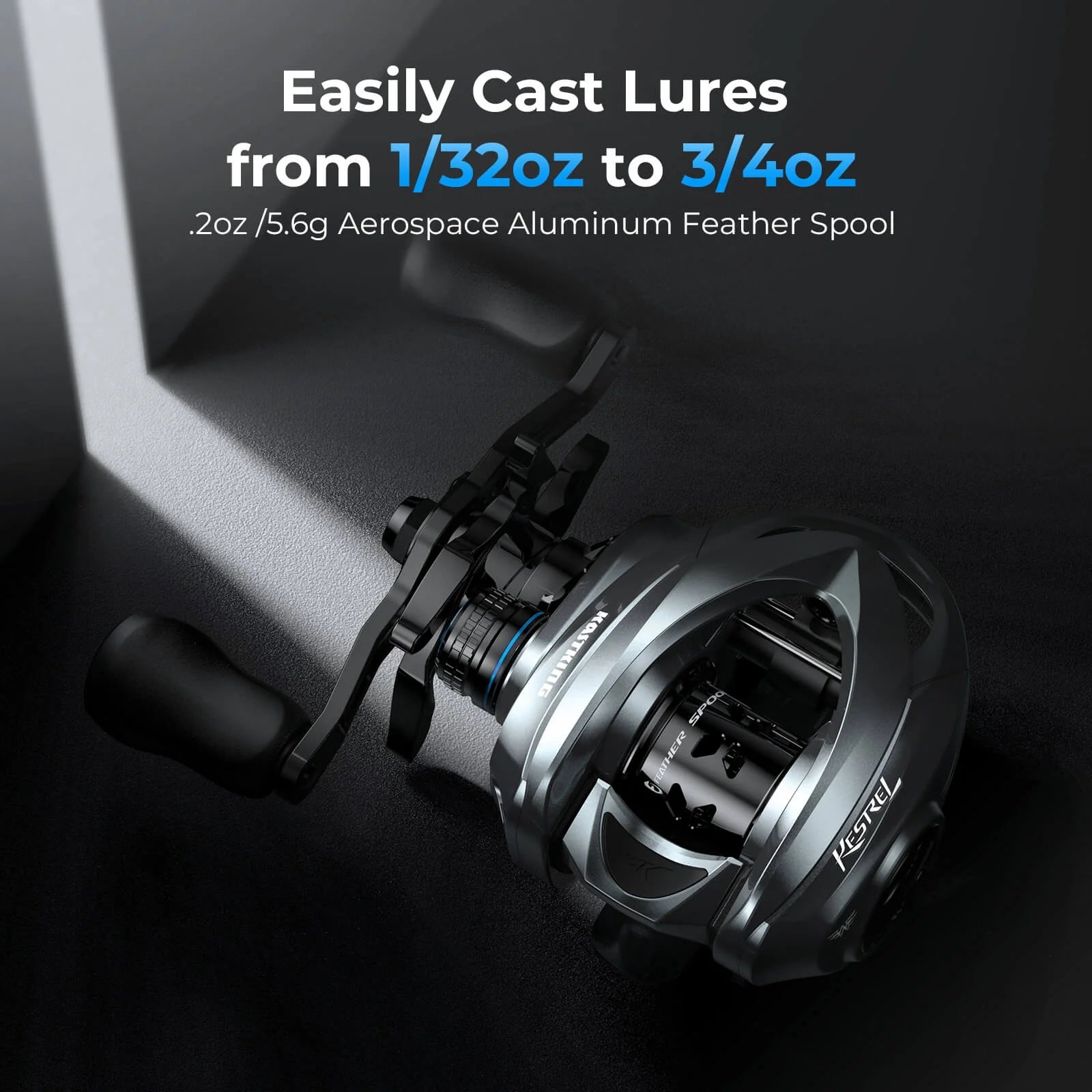 Weighing in at an ultra-light 4.5 ounces, the Kestrel Baitcasting Reel combines feather-light design with rigid performance. The Kestrel Baitcasting Reel redefines angling with a host of premium features. Its TPE handle, meticulously designed for comfort, ensures a superior grip, turning every cast into a pleasure.