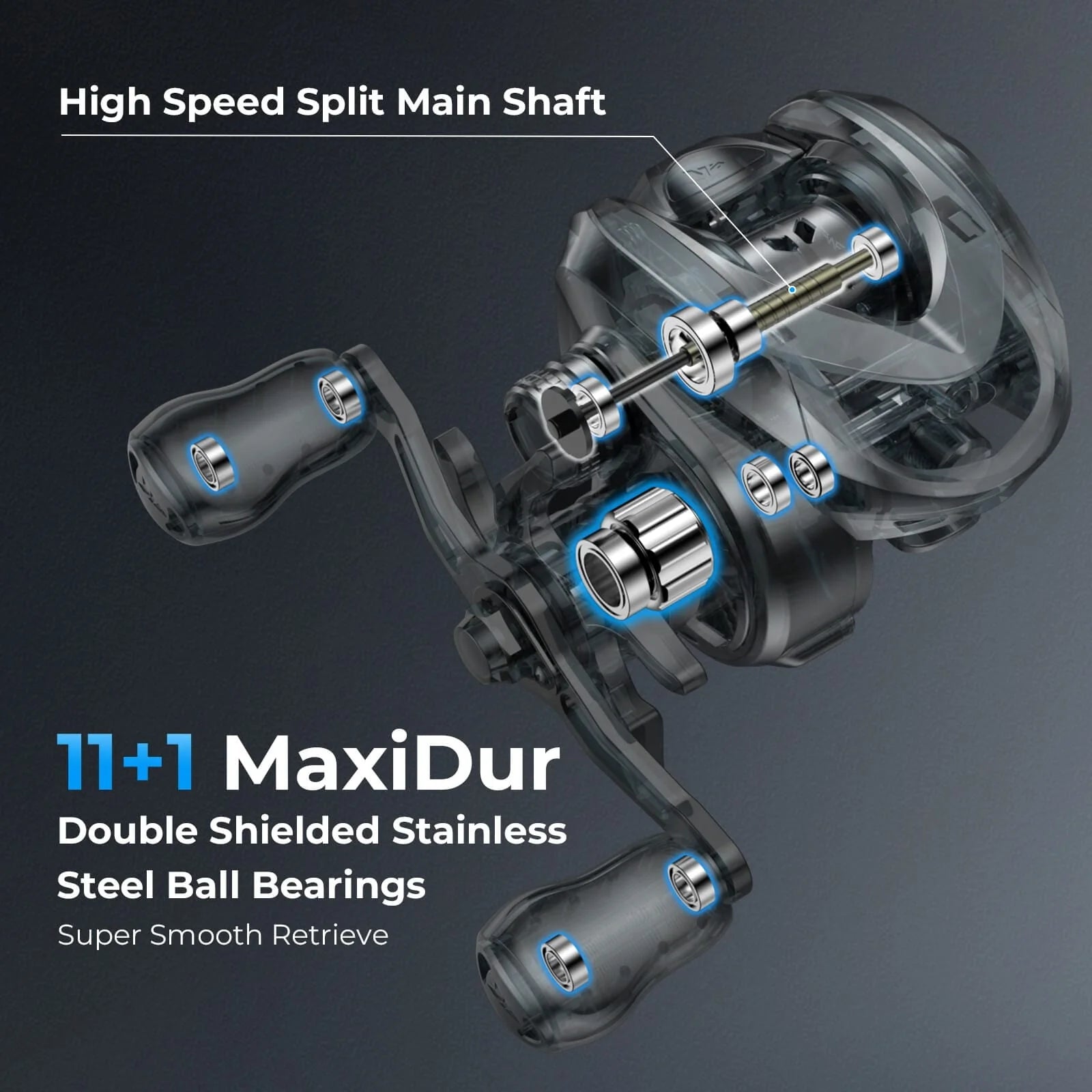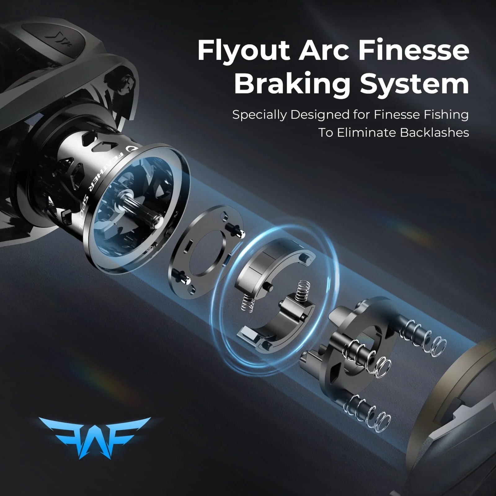 Equipped with the Finesse Optimized FAF (Flyout Arc Finesse) Braking system: Two half-ring magnetic brakes automatically adjust to slow down the spool when braking is needed to prevent backlashes. As the speed of the spool decreases, the magnetic field inside the spool diminishes and the magnets retract to maximize casting distance. There is also an external fingertip brake adjustment dial for fine tuning spool speeds for smaller baits.