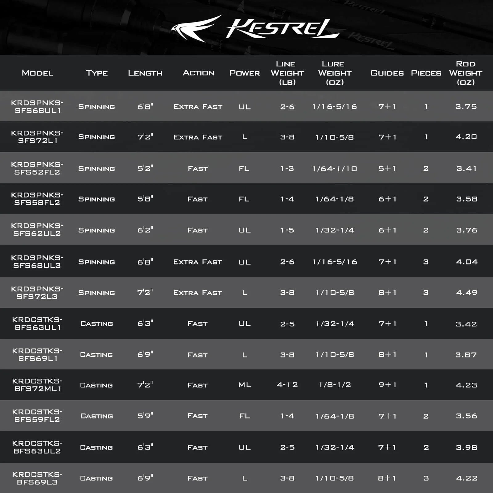 The KastKing Kestrel Bait Finesse System and Spin Finesse System Fishing Rods are designed for easy casting of ultra-light baits in tight spaces. Pair with the Kestrel casting or spinning reel series for incredible performance.