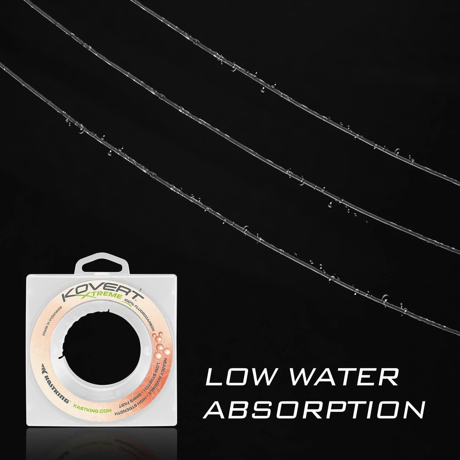 Kovert Xtreme fluorocarbon fishing line is 78% heavier than water which makes it sink super-fast versus traditional monofilament line. Fast sinking is a distinct advantage in many fishing situations where getting the bait or lure in front of the fish quickly, increases catch rates.