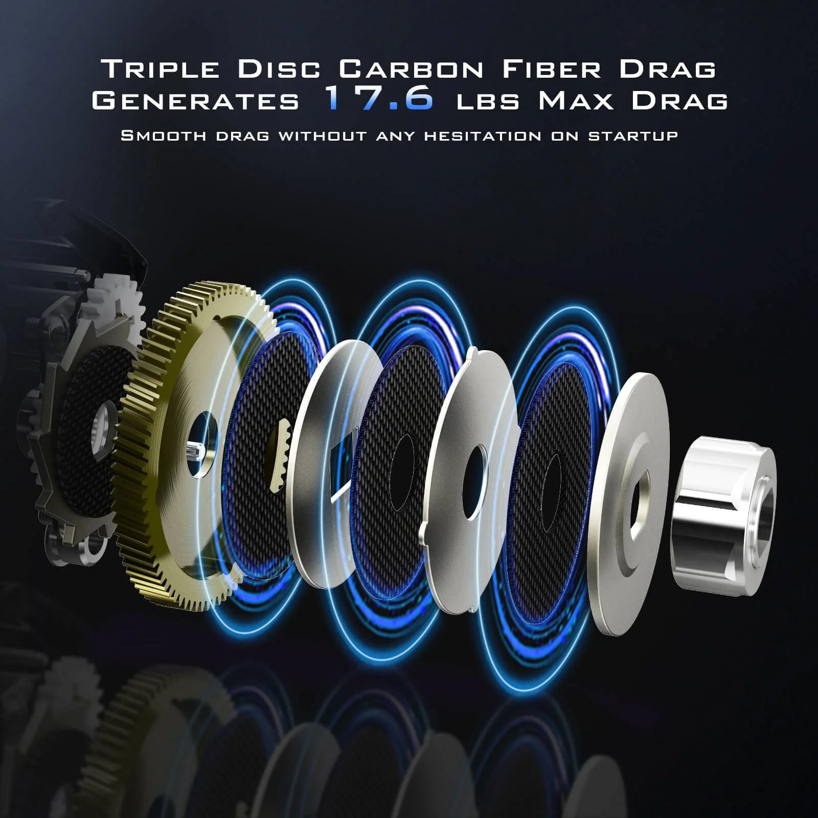 MegaJaws Elite fishing reels have a revolutionary, patented-design "Auto-adjustment Magnetic Braking System" (AMB) that never backlashes. This is a big deal for casting reels. The AMB system automatically adjusts the brakes depending on the speed of the spool. With the KastKing AMB system you can cast farther and never worry about backlashes again. With the MegaJaws Elite baitcaster, you can make it possible to cast further than any other casting reels.
