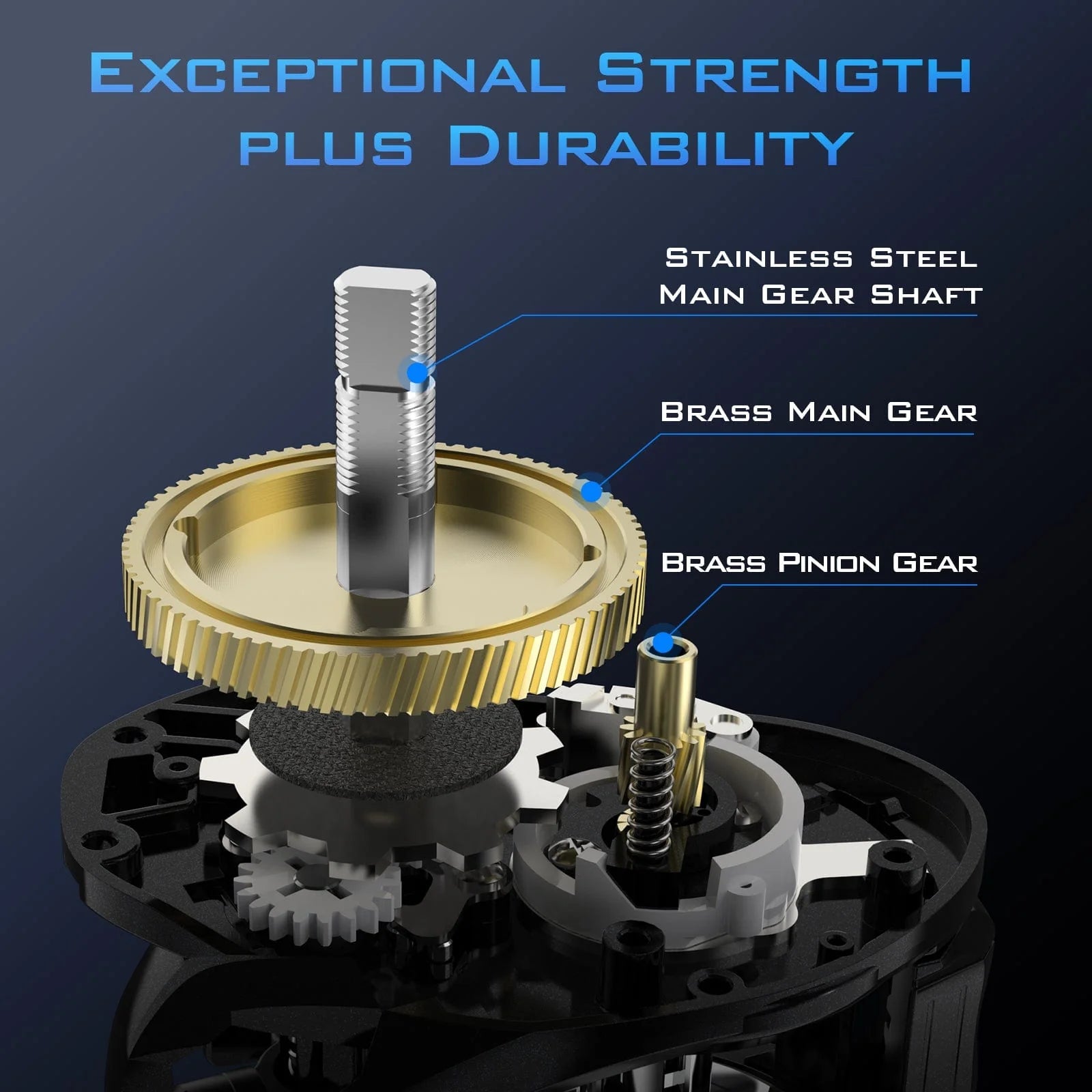 Precision machined brass main gear and brass pinion gear provide exceptional strength plus durability.