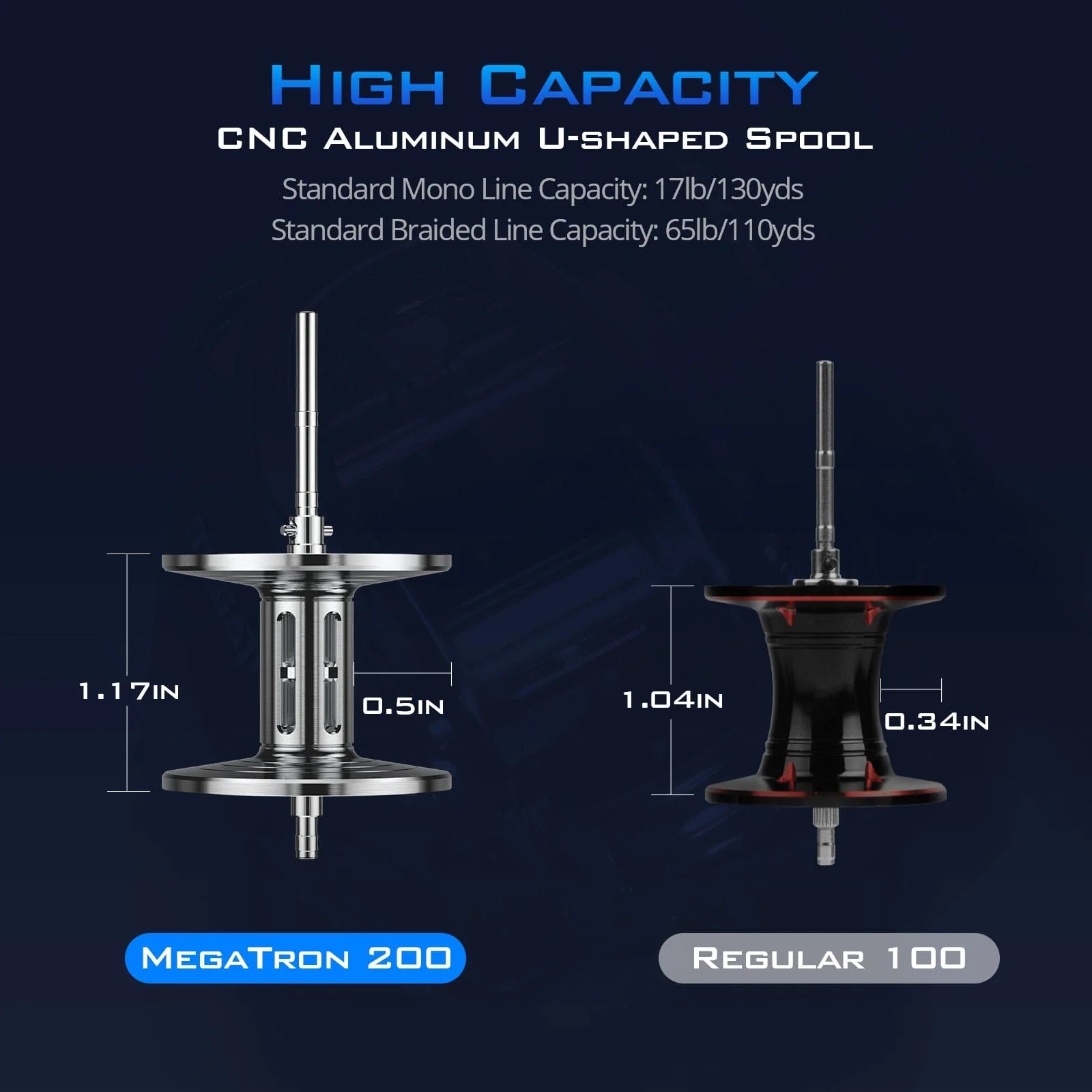 While the new MegaTron 200 casting reels feature a larger frame and higher line capacities than normal baitcaster reels, they are still designed with a low-profile shape for comfortable, all-day fishing.