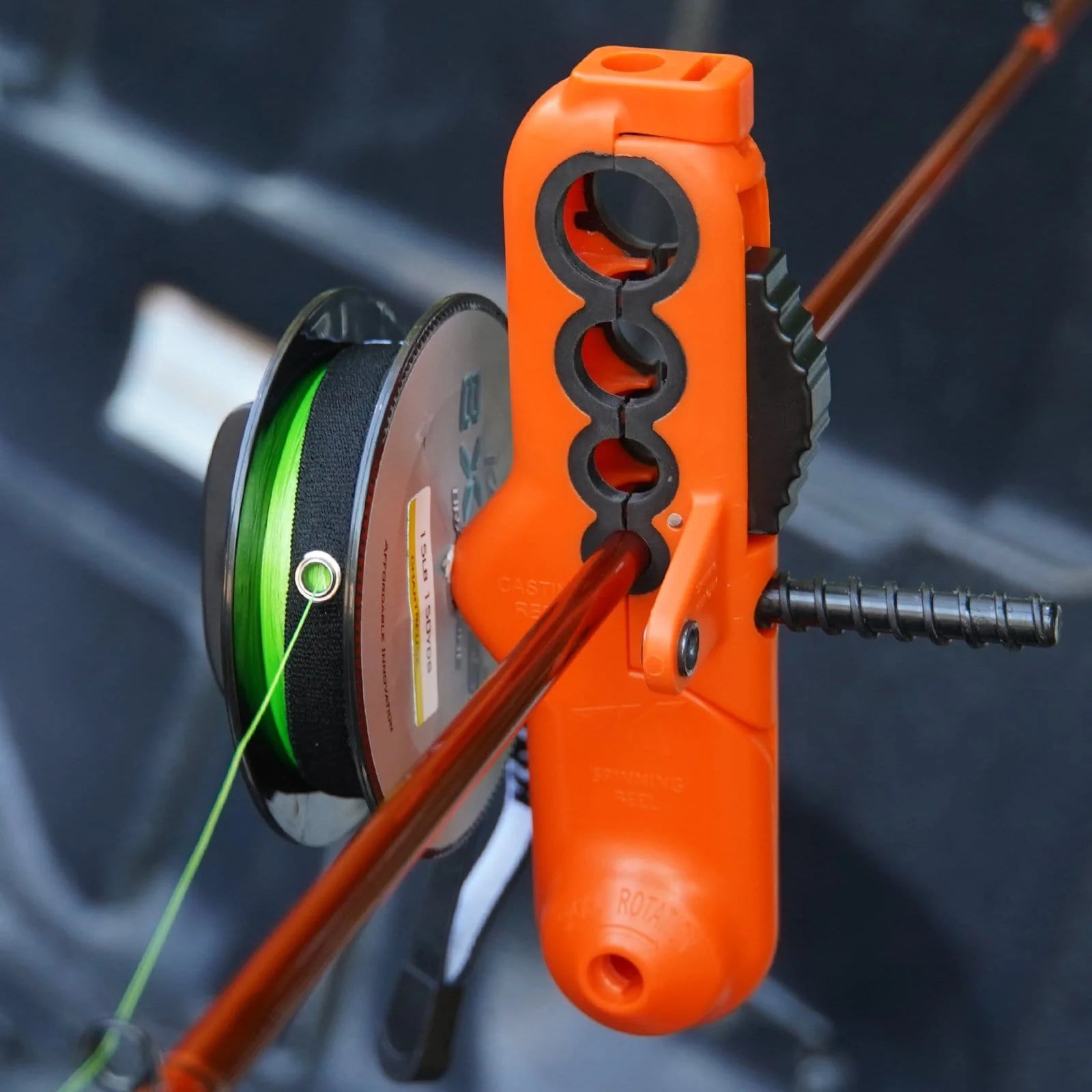 - KEY FEATURES – Unique patent pending design - Spool spinning reels and casting reels without fishing line twist – compact design for easy storage and portability – 1/4lb spool capacity – Soft touch clamping points protect rod blanks – adjustable line spooling tension bands ensure that line is spooled tightly on the reel - works with monofilament, fluorocarbon, and braided fishing line.