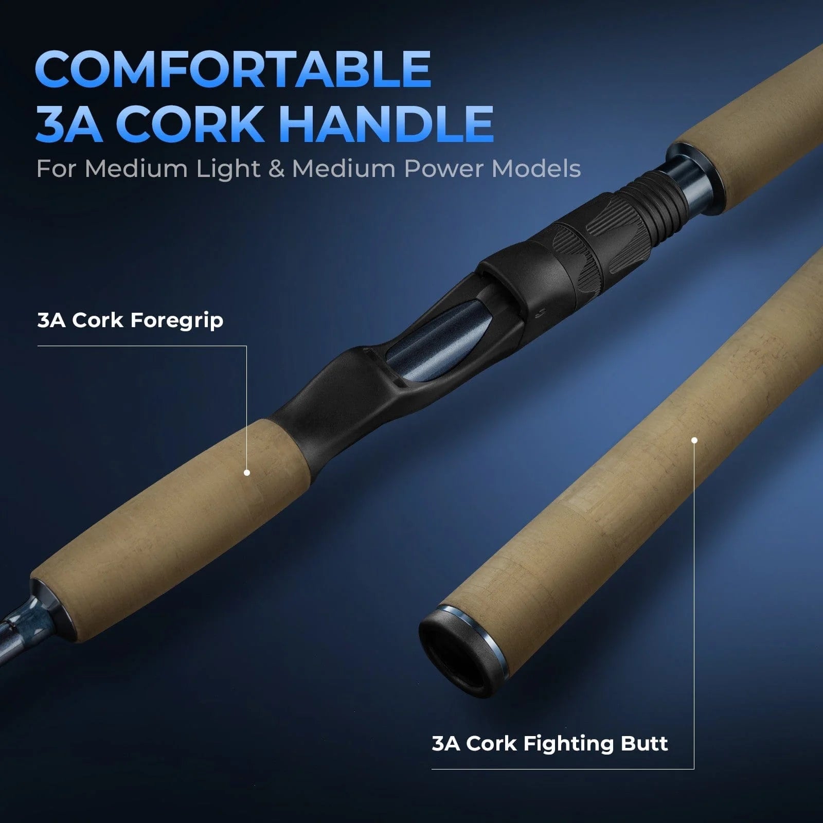 The lighter ReKon spinning rod features comfortable 3A cork handles, while the larger model is equipped with slip-resistant EVA handles. The rod also includes a large fighting butt and an extended foregrip for battling big fish. The stainless steel guide with zirconia rings ensures smooth line flow, while the graphite uplock reel seat firmly holds large reels, even under the strain of powerful fish.