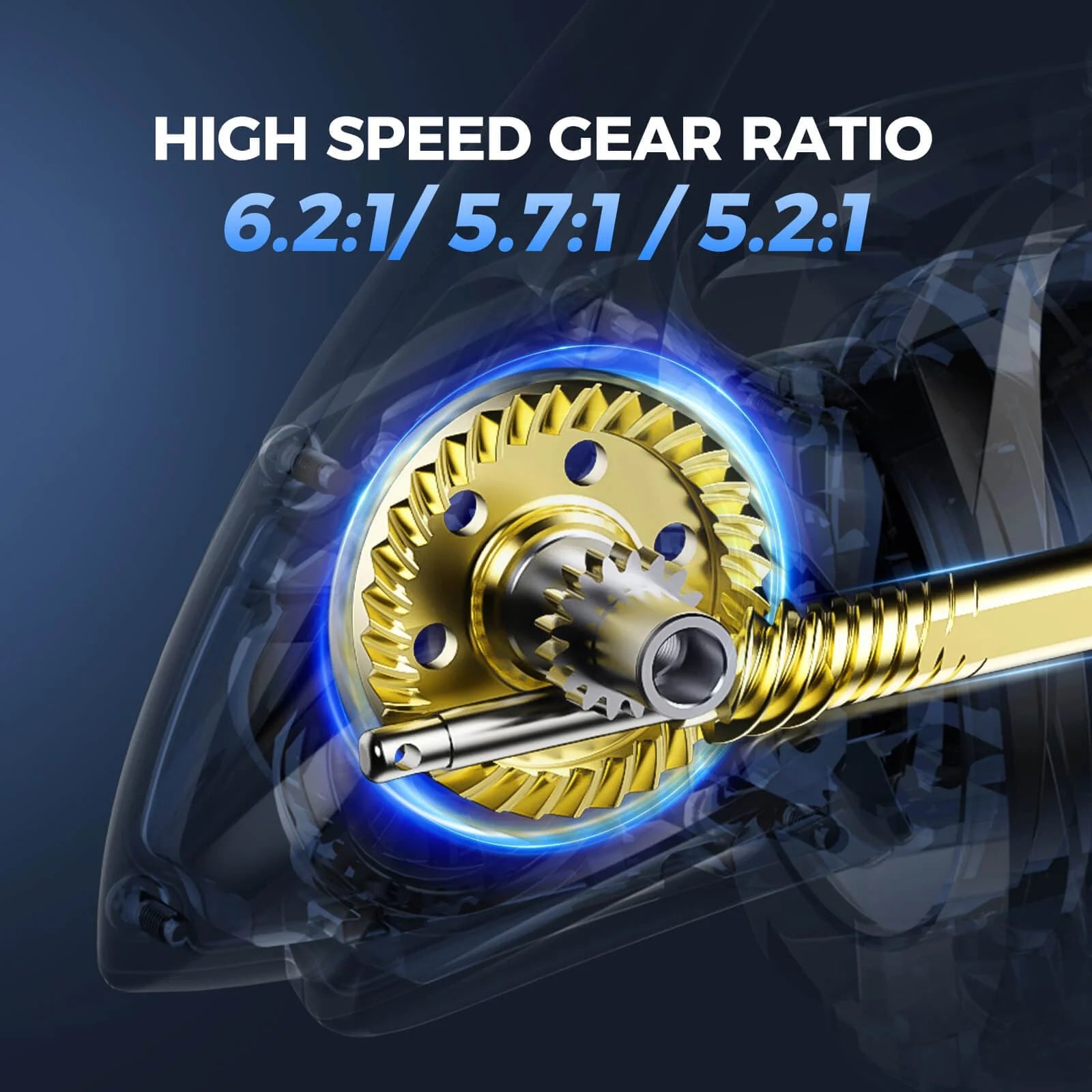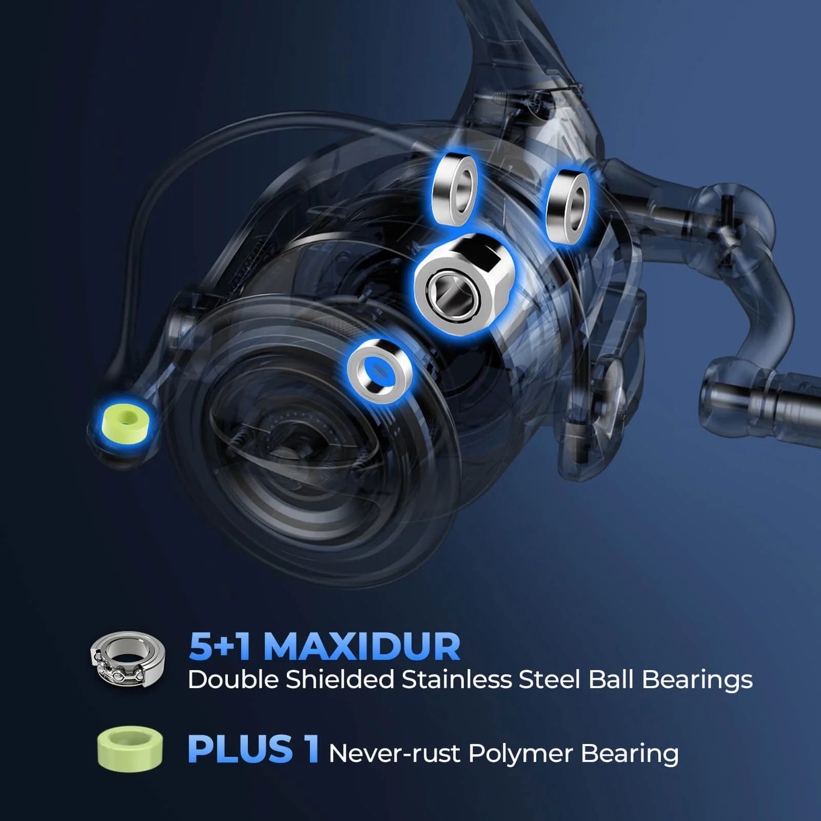 Experience smooth operation in challenging conditions with 5 MaxiDur double-shielded stainless steel ball bearings. A specially designed polymer roller bearing and an 8-pin stainless steel one-way bearing prevent reversals. Gear ratios vary across sizes: 2500/3000/4000 offer 6.2:1, 5000/6000 feature 5.7:1, and 8000 presents 5.2:1, ensuring both rapid and powerful retrieves.