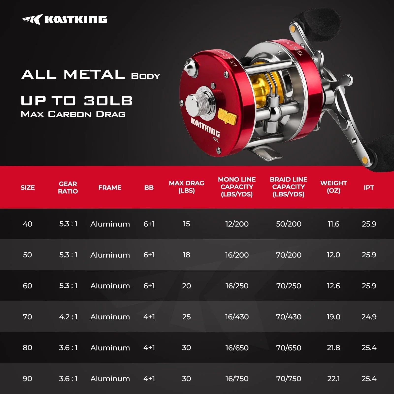KastKing Rover baitcasting fishing reel is a conventional reel for trolling, bottom fishing, and other techniques used in freshwater and saltwater (Size 40 – 60 with 2-pin centrifugal brake that is good for casting). The oversized nonslip EVA grips, line out clicker alarm, easy access thumb bar spool release (40-60 sizes) and the classic look are everything you would expect of a round baitcasting fishing reel.