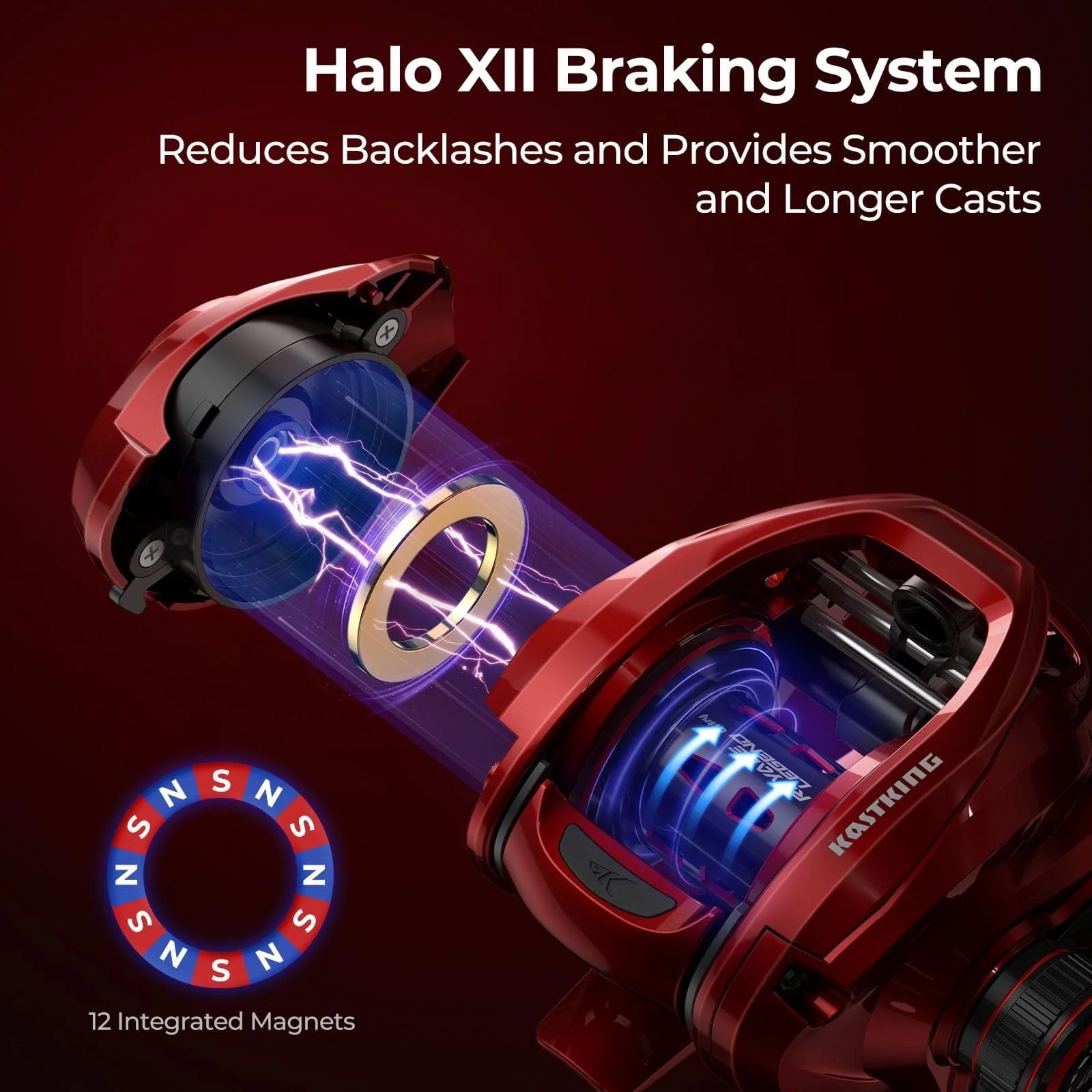KastKing's latest release in braking innovation - Exclusive Halo XII Magnetic Braking System, crafted a total of 12 integrated magnets into a one-piece, seamless ring braking system that provides smoother and longer casts. This design also offers enhanced stability and effectiveness in preventing backlashes.