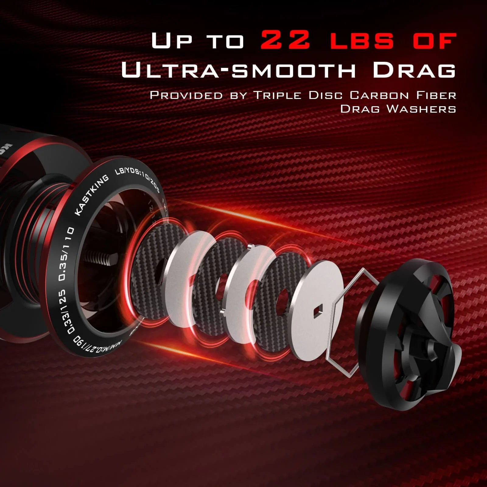 The new KastKing Royale Legend Glory spinning reel has a three-layer carbon fiber disc drag system that gives you the smoothest drag possible for using light fishing lines and leaders. With up to 22 lbs of stopping power, you’ll always be in control.
