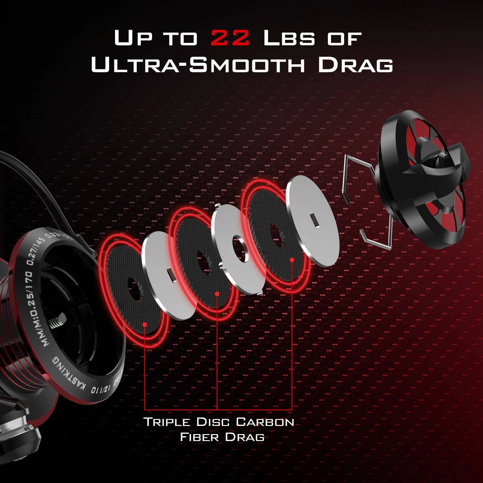 This KastKing Royale Legend II fishing reel gives you 5 remarkable double shieled stainless steel ball bearings, precision machined high-alloy and brass gears, up to 22 lbs of carbon fiber drag, zero-rust graphite frame and body, braid fishing line ready aluminum spool, and stainless steel hardware.