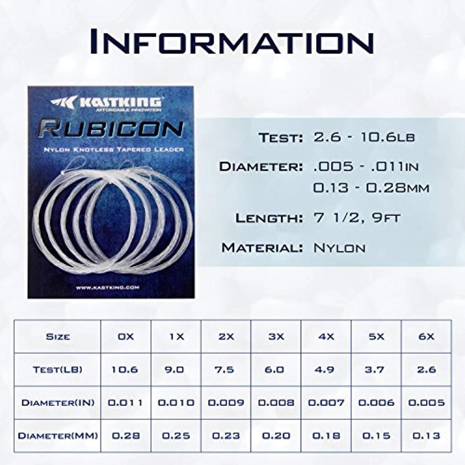 EXCEPTIONAL VALUE - Rubicon leaders are packed (5 same size leaders) per retail package, while the super value package(6 leaders) consist of 2 pcs of 3X, 2pcs of 4X and 2pcs of 5X leaders. KastKing is a sponsor of Trout Unlimited and we proudly support the efforts of their 300,000 members nationwide to develop and restore natural trout habitat.