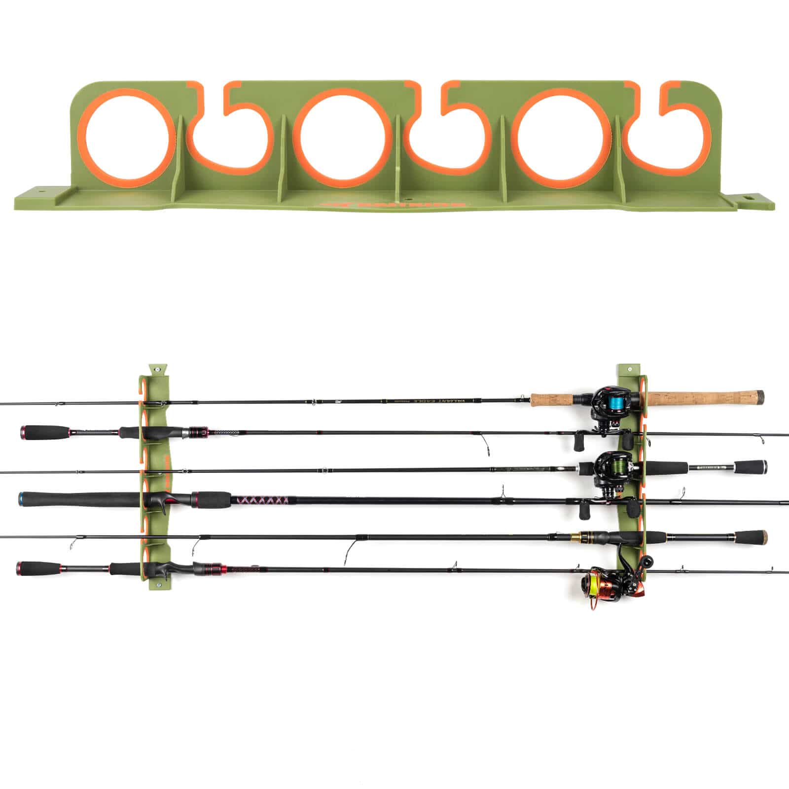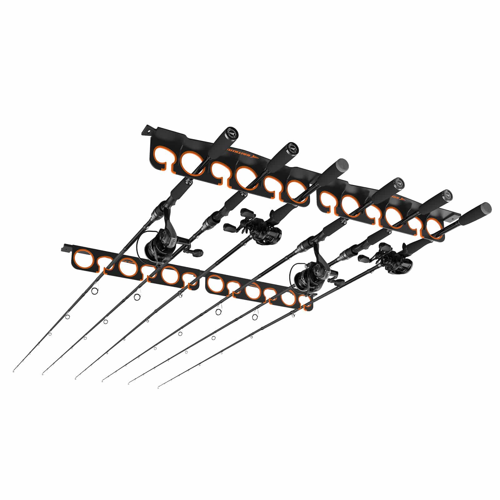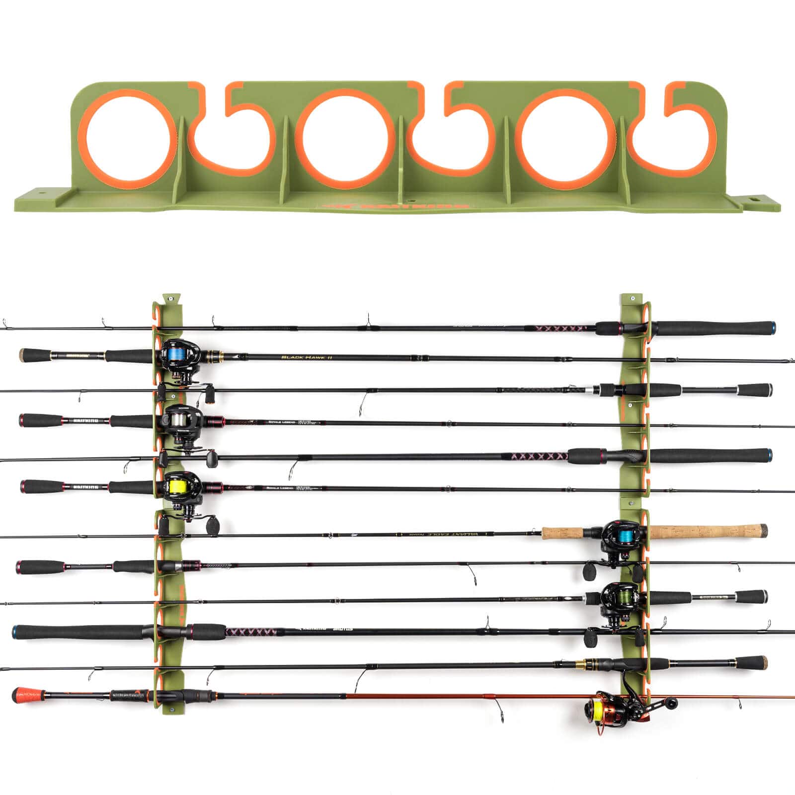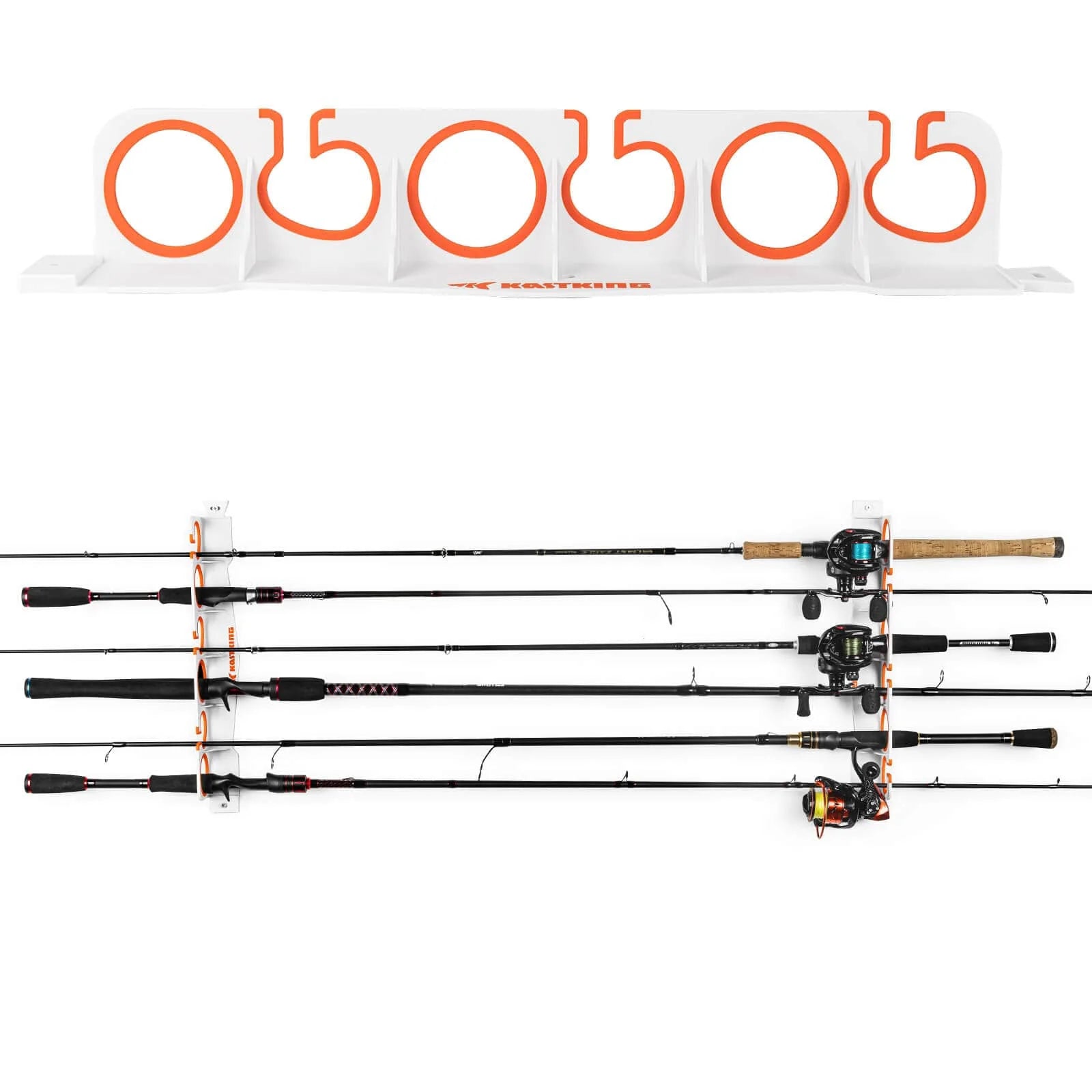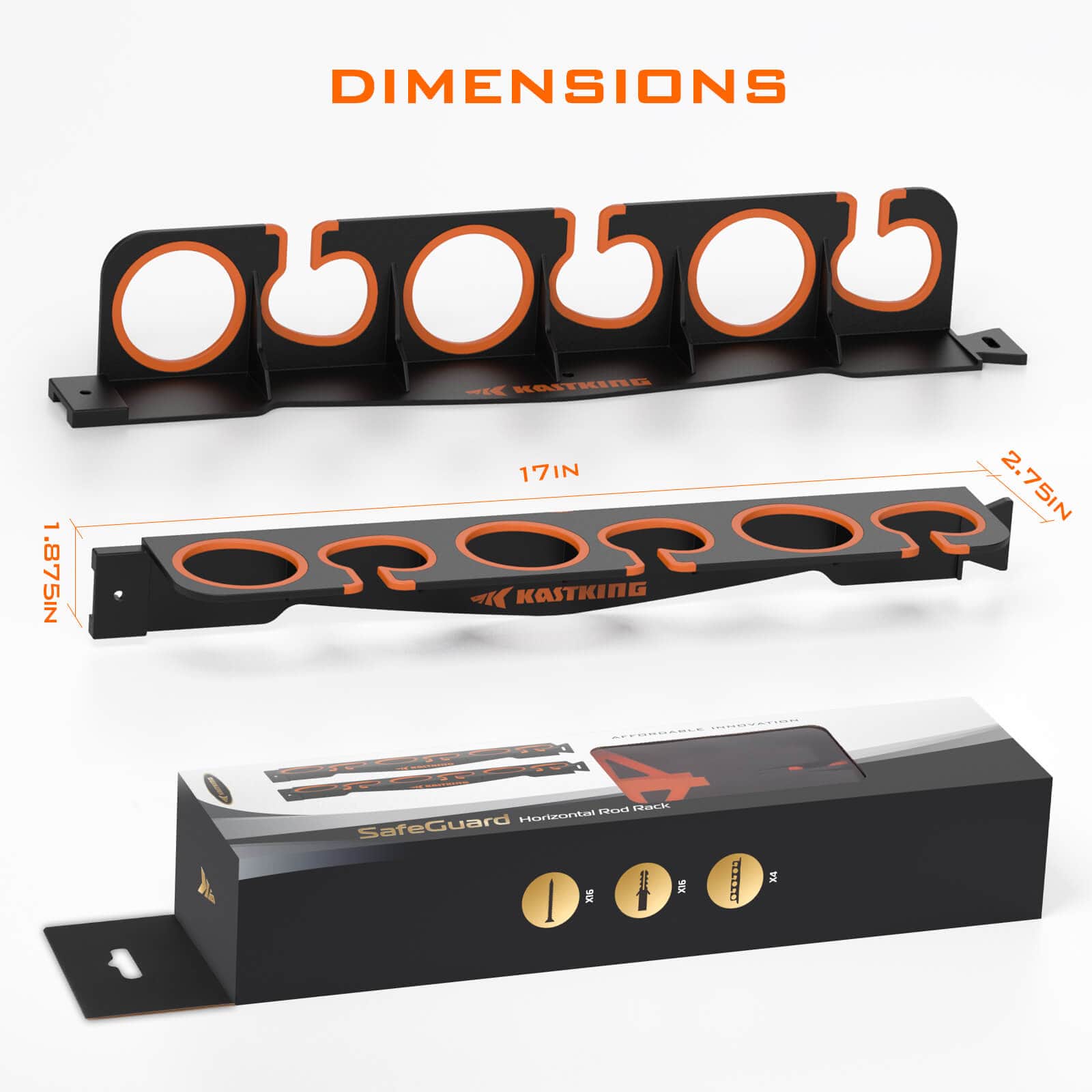 The KastKing SafeGuard fishing rod rack can store up to 6 rods or combos in less than 18” of wall space. We have also designed interlocking ends making it easy for you to string a series of SafeGuard rod racks together for even greater storage capacity.