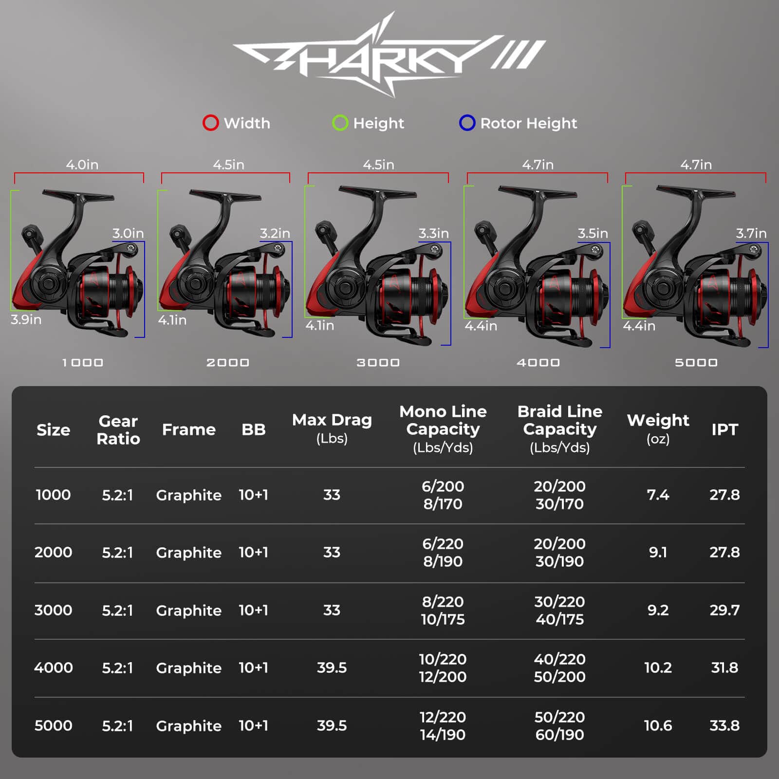 Sharky III spinning reel is loaded with features, including 10 + 1 high quality, saltwater rated double shielded stainless steel ball bearings, instant lock anti-reverse, stainless steel hardware, aluminum handle, and more line capacity than other brands. It is the best all-around spinning reel for every angler.