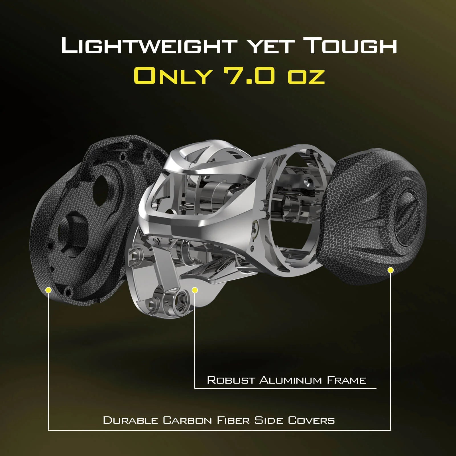 The robust aluminum frame of Skeet Reese Icon Baitcasting Reel paired with highly durable carbon fiber side plates provide considerable strength while limiting the overall weight to only 7oz.!