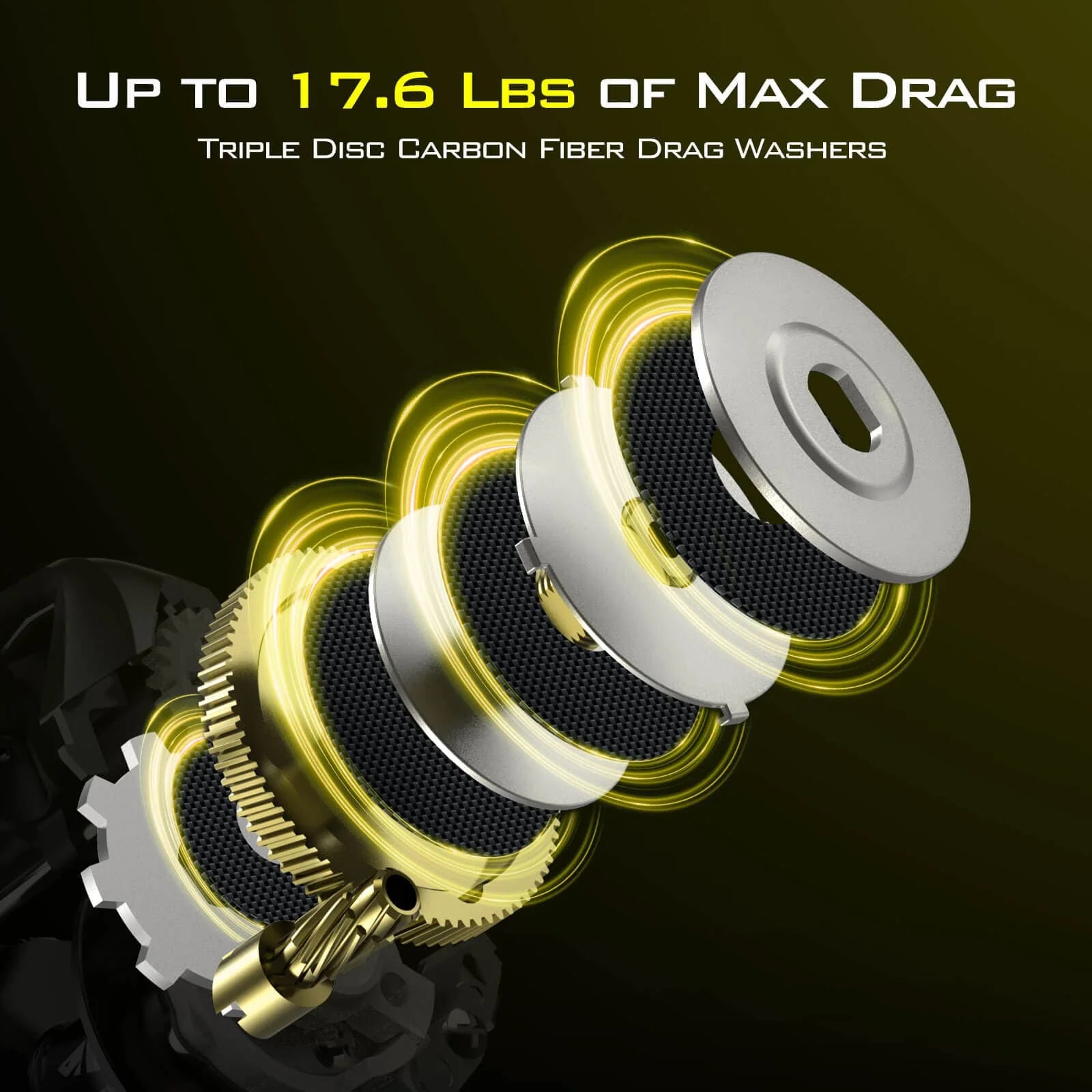 Triple Disc Carbon Fiber Drag Washers provide up to 17.6 lbs. of maximum drag to stop fighting fish. And the double bearing supported pinion gear is 35% smoother under load and 30% more durable.