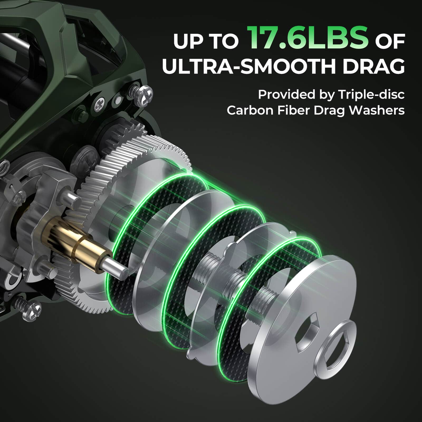 The KastKing Spartacus II casting reel is built for ultra-smooth casting and retrieval with its 7+1 MaxiDur bearing system. With 17.6 pounds max drag, it handles big catches with ease, while the 7.2:1 gear ratio provides faster line retrieval. Constructed with aerospace aluminum main gears and brass pinion gears, this reel offers lightweight durability and reliable performance, making the KastKing rod and reel combo an excellent choice for anglers in all fishing conditions.