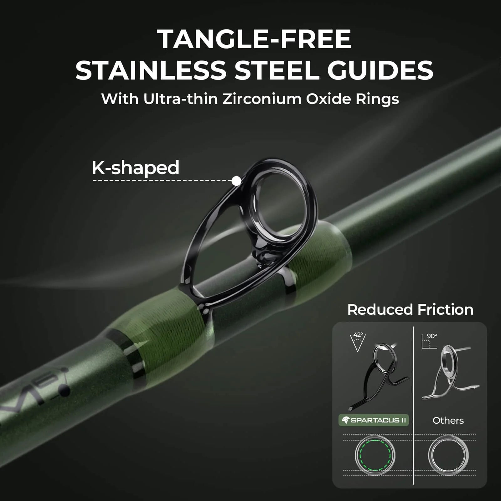 Equipped with stainless steel guides with ultra-thin zirconium rings, the KastKing Spartacus II Twin-Tip Casting Combo minimizes friction for smooth, long casts and consistent performance. Custom reel seats, rubber cork handles, and patented built-in hook keeper ensure a secure and convenient grip, enabling anglers to fish for extended periods without fatigue or interruption.