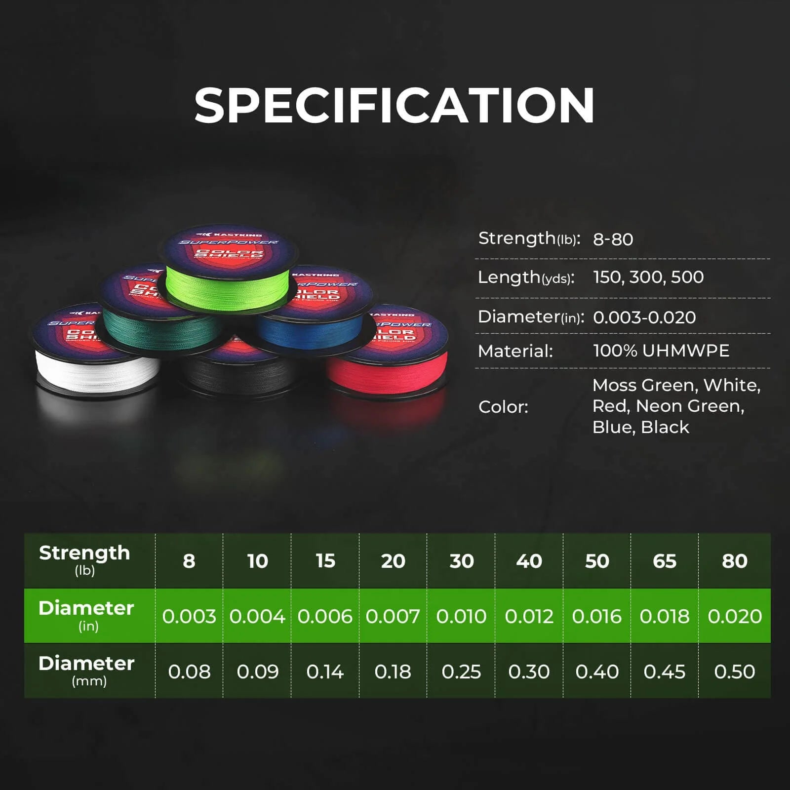 SuperPower ColorShield braided fishing line is engineered with solution dyed UHMWPE for colorfast properties. Solution dyeing ensures that the color remains for the life of the line and does not bleed, maintaining its visual appearance. SuperPower ColorShield braided fishing lines have excellent colorfast properties, and retain their vibrant color with continued use, even after repeated exposure to sunlight, water, and harsh fishing conditions.