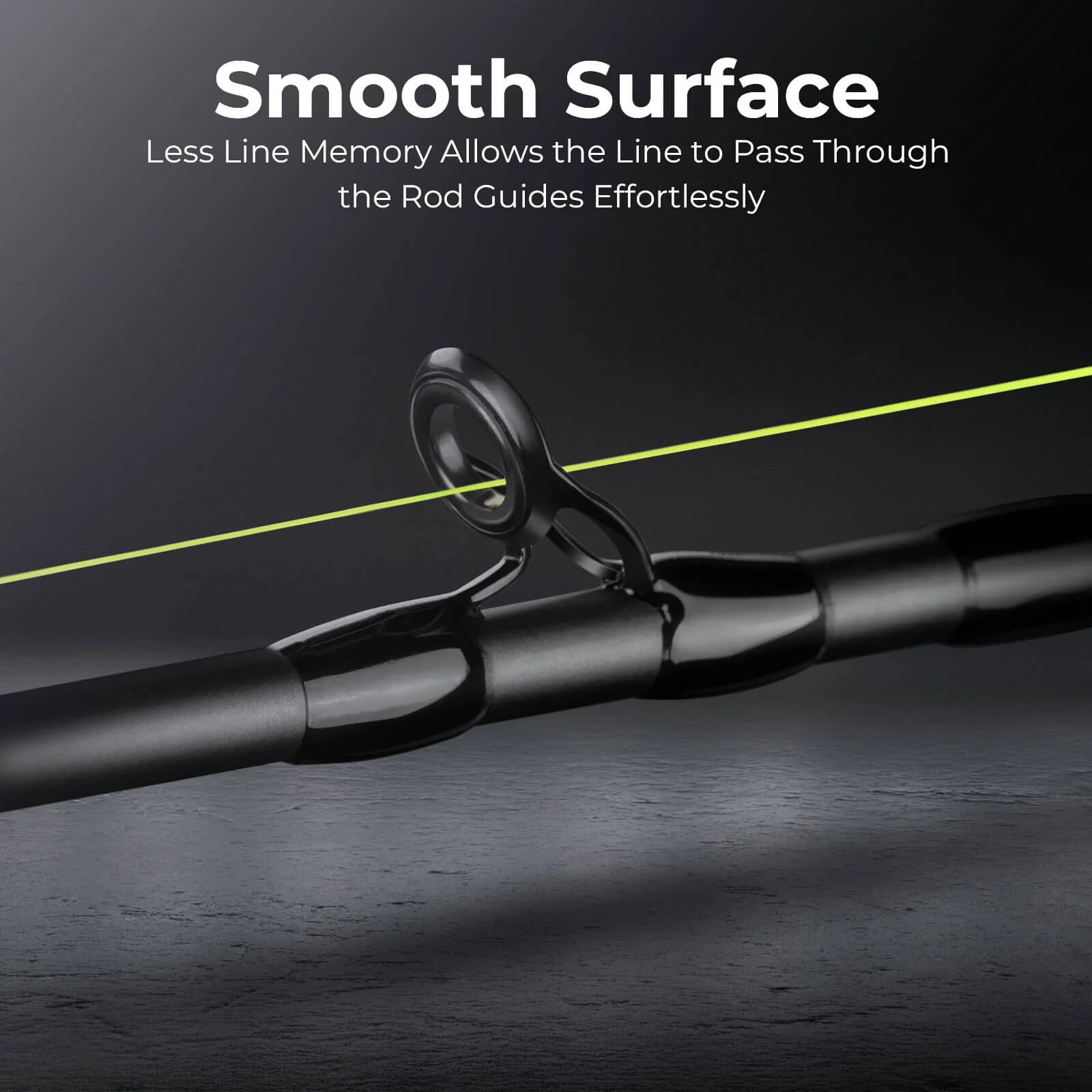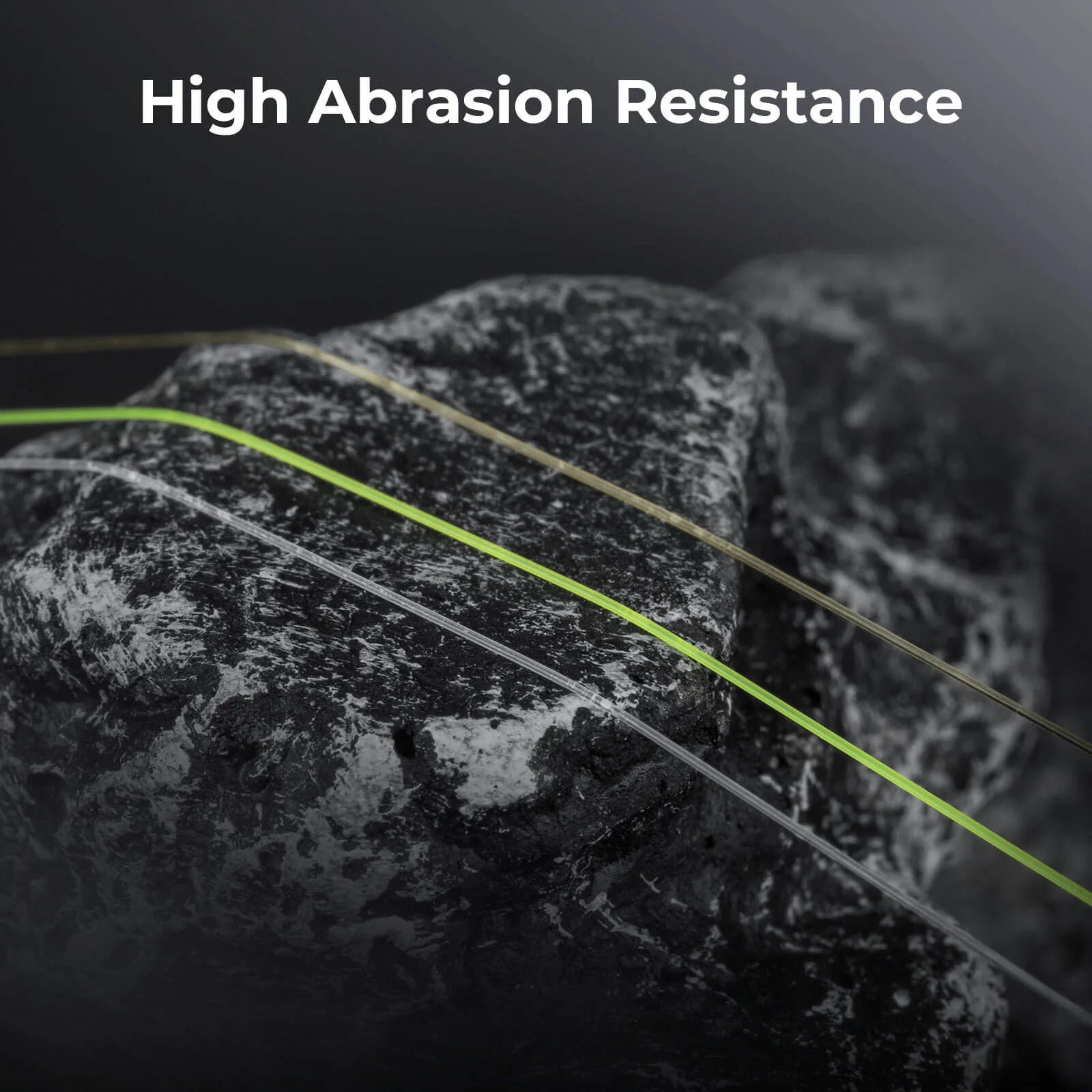 The mono fishing line exhibits abrasion resistance that exceeds traditional copolymer monofilament and fluorocarbon by up to 2X. Better abrasion resistance allows you to fish heavy structure such as boat docks, submerged brush piles, and rocky bottoms with less concern over line failure. Higher abrasion resistance also equates to greater knot strength which means fewer lost fish due to knot failure.