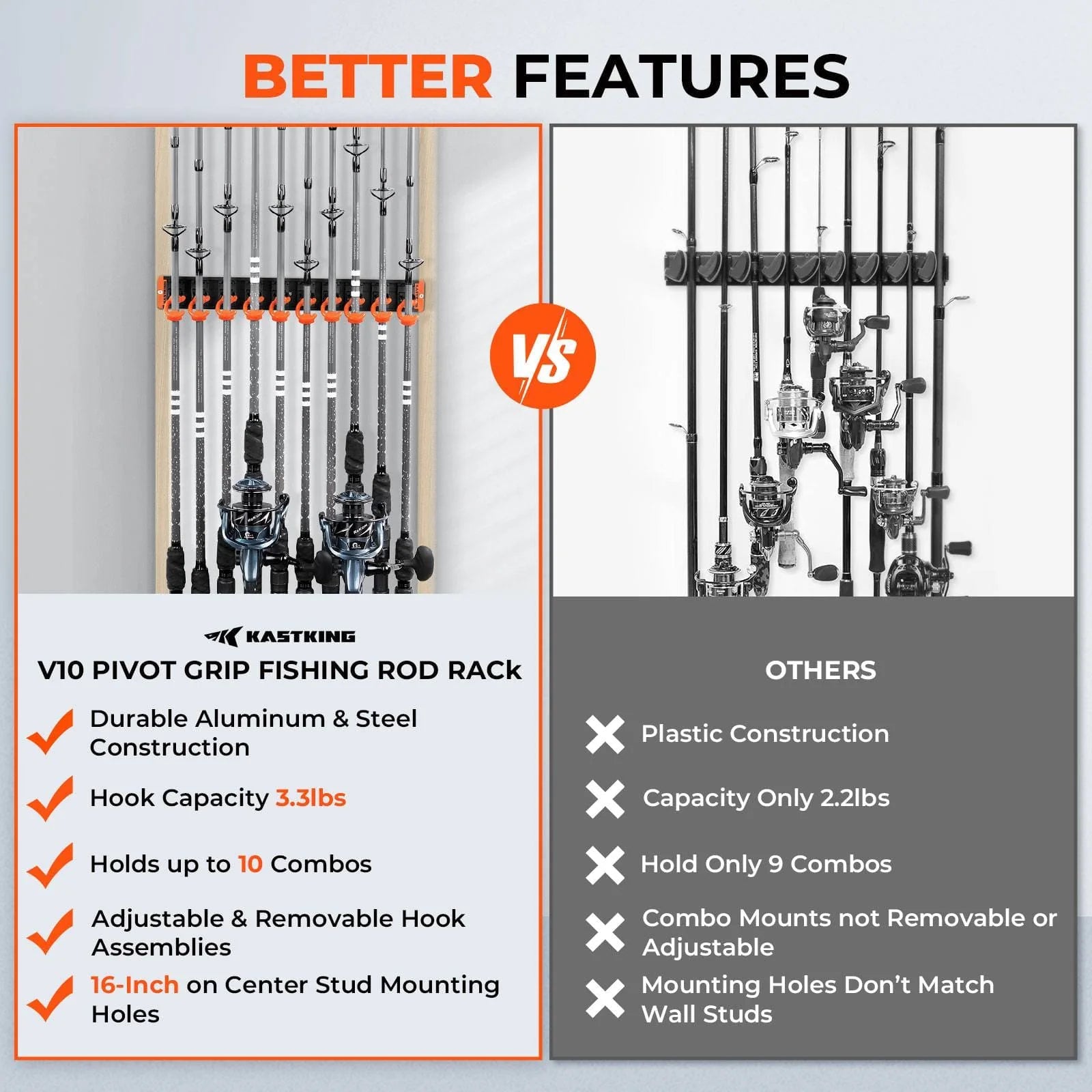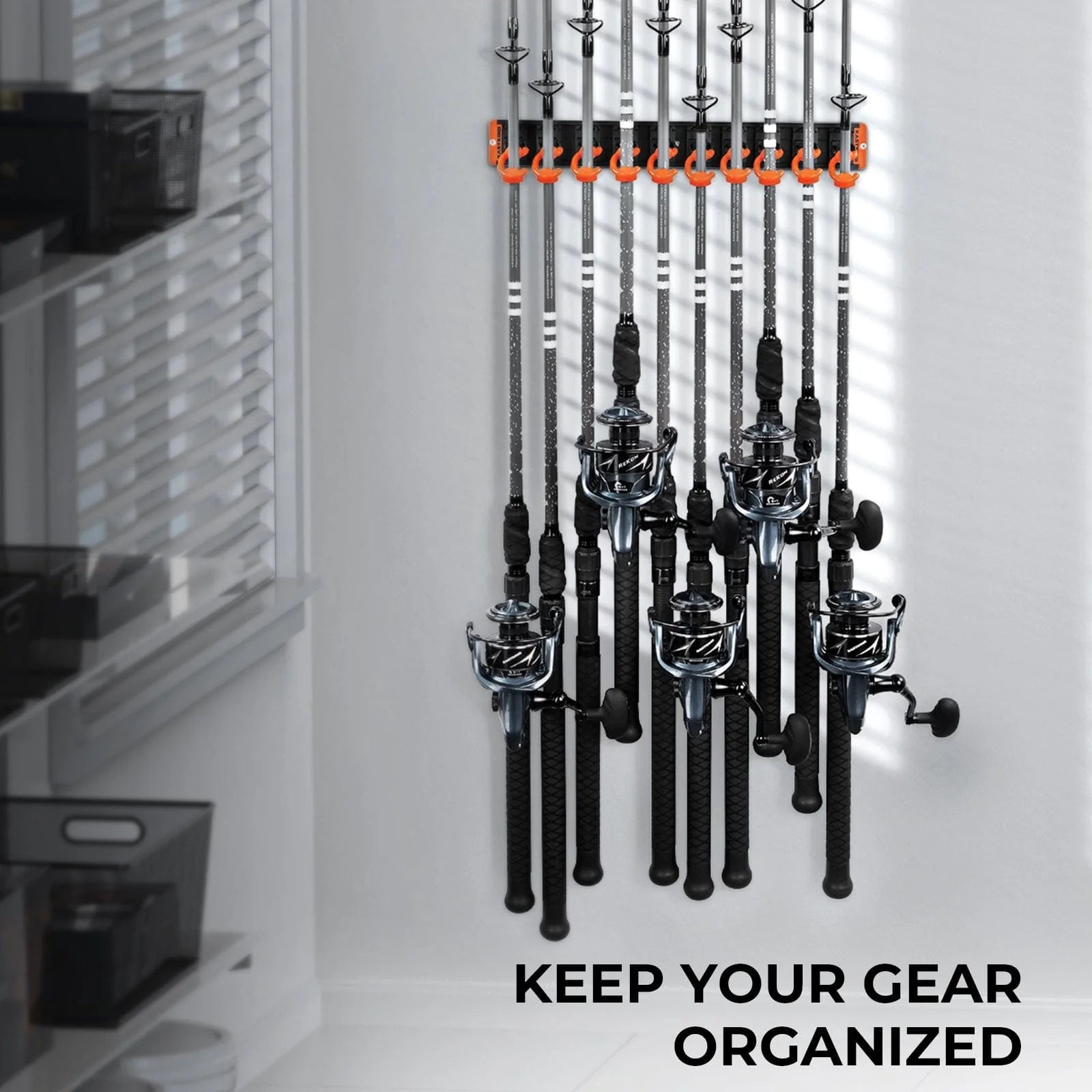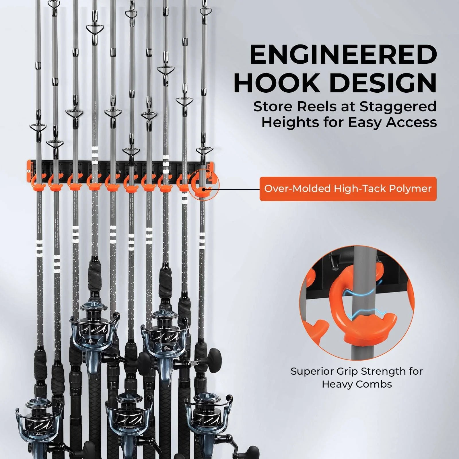 The V10 Pivot Grip Fishing Rod Holder is designed to store up to 10 rod and reel combos while utilizing less than 16.5 inches of wall space. This compact design ensures your fishing gear stays organized and easily accessible without cluttering your garage, shed, or fishing room. Perfect for anglers looking to maximize storage in small or shared spaces.