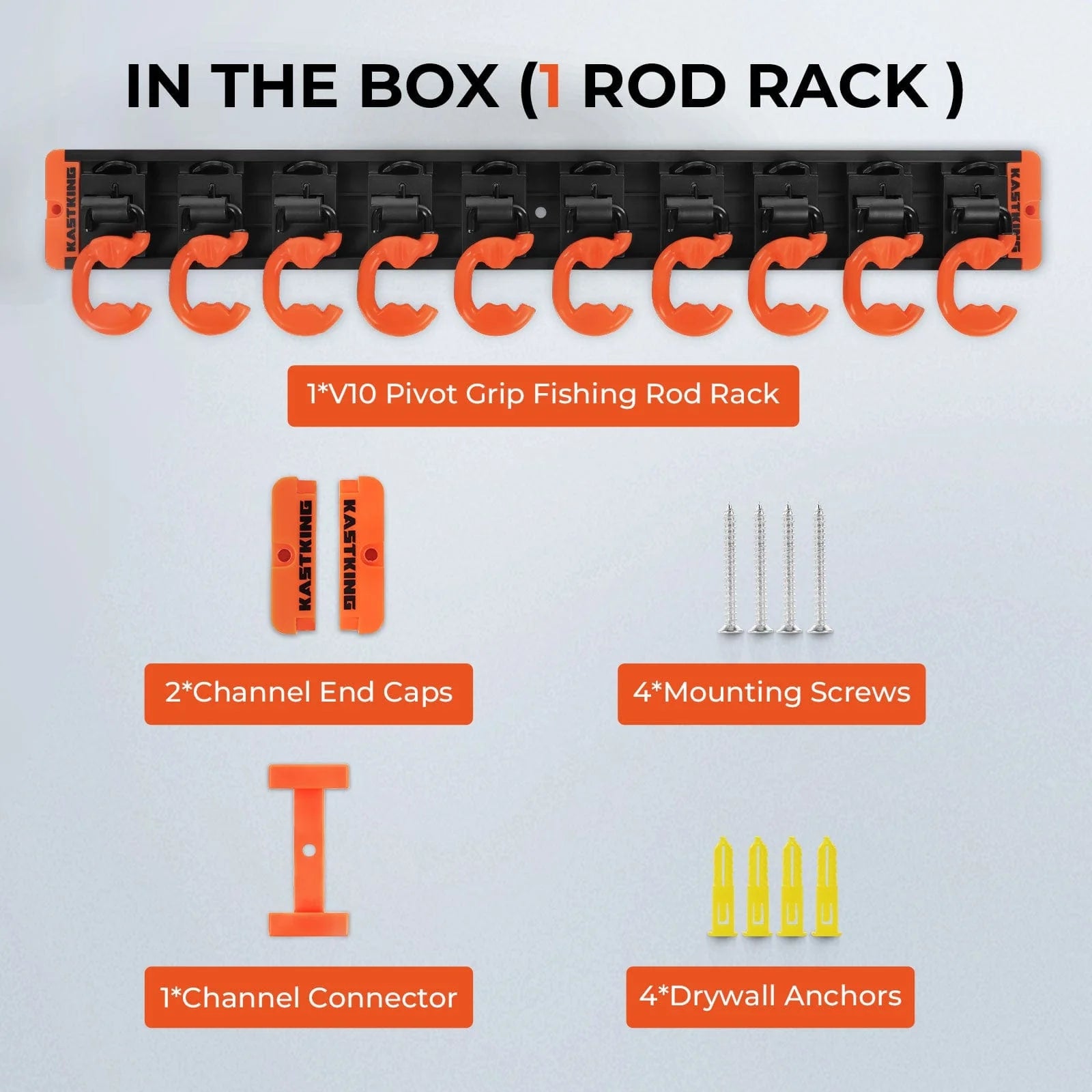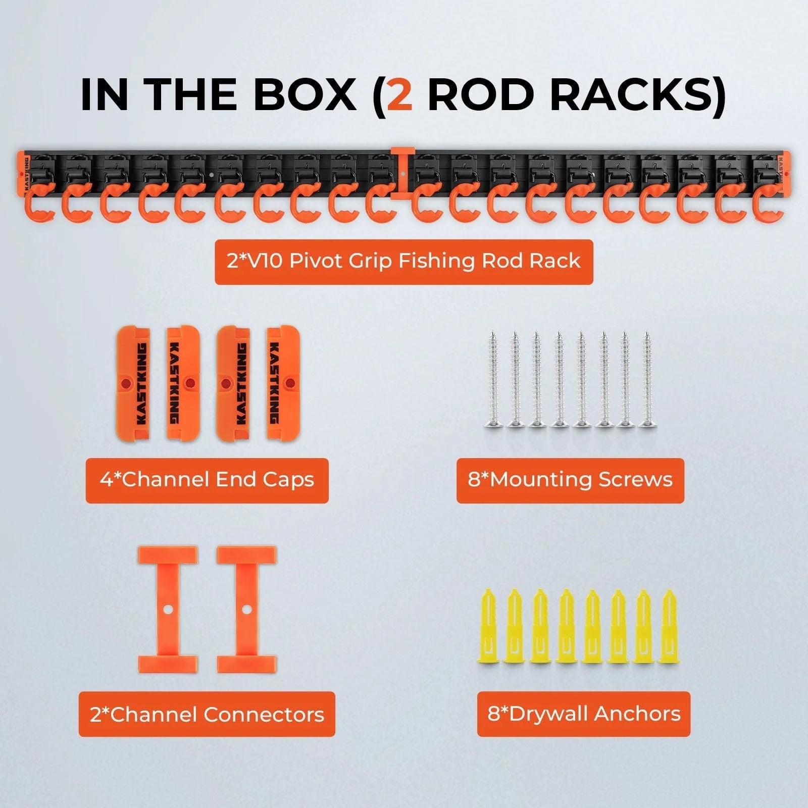The V10 Pivot Grip Rod Holder is designed for simple, secure mounting. Pre-drilled holes are spaced 16 inches on center to align perfectly with wall studs, ensuring a strong and stable installation. The package includes all necessary hardware, including a channel connector, four mounting screws, and drywall anchors, so you can get your fishing rod rack set up quickly and confidently.
