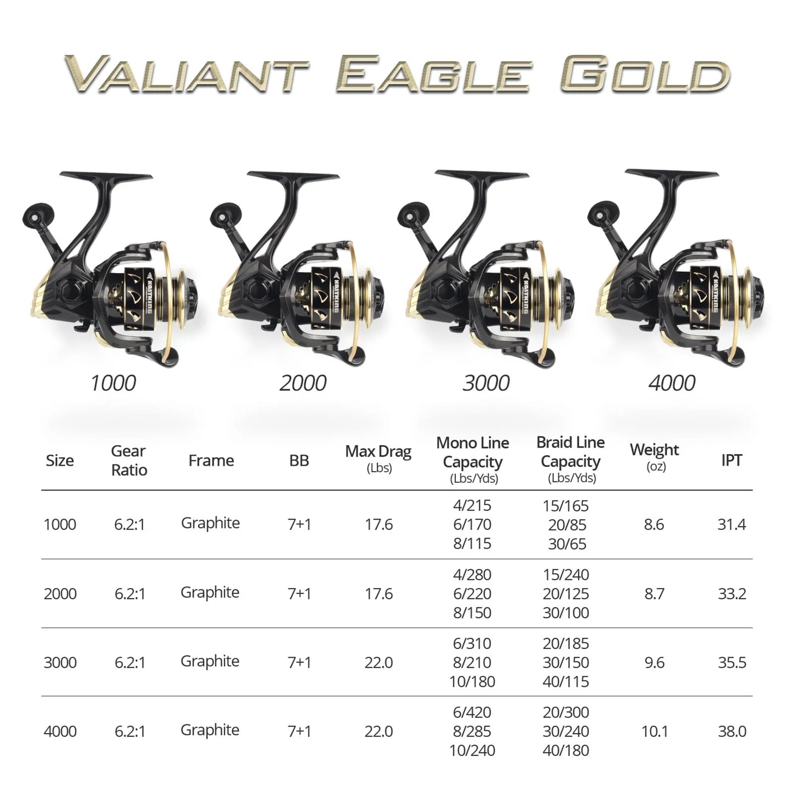 The new, dynamic KastKing Valiant Eagle Gold spinning reel is part of the KastKing series of Valiant Eagle spinning reels. This edition with sparkling gold trim salutes the Golden Eagle, one of the best-known birds of prey in the Northern Hemisphere. Like a Golden Eagle, the Valiant Eagle Gold edition reel is built for power and speed as a freshwater or saltwater spinning reel.