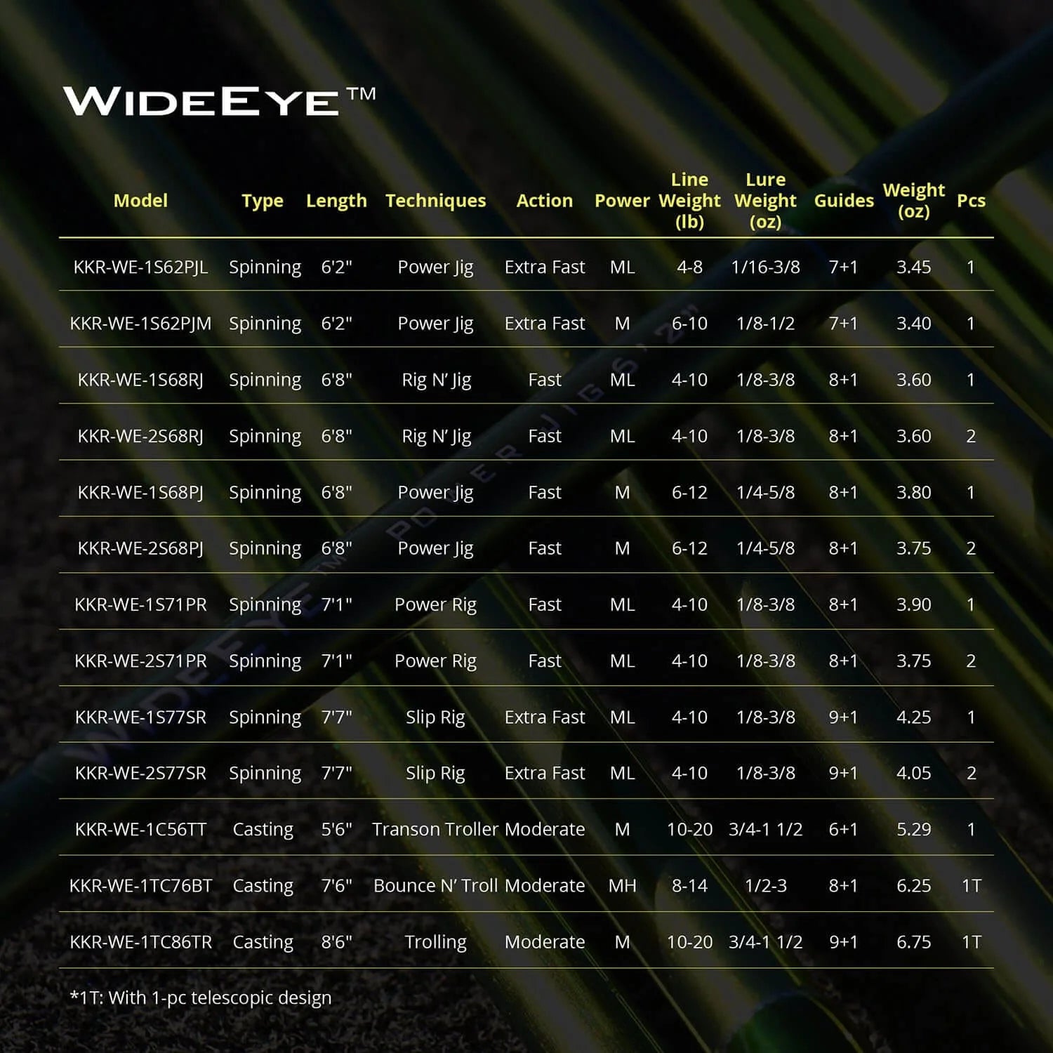 WideEye Walleye rods are one of the lightest rod you'll ever own and reduce fatigue. Weights start at under 3.5 ounces. These ultra-light weight high-carbon fishing rods are made possible through advanced IM9 fishing rod blank technology, high end components and AAA cork split rear handle design on spinning rod models.